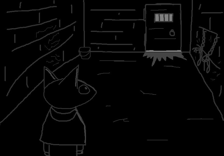 In the far left corner, a lone bucket sits. On the wall to my right, I can make out what seems to be a pair of skeletal arms hanging from some chains. There is also a wooden door with a barred window. A soft light flickers beyond.