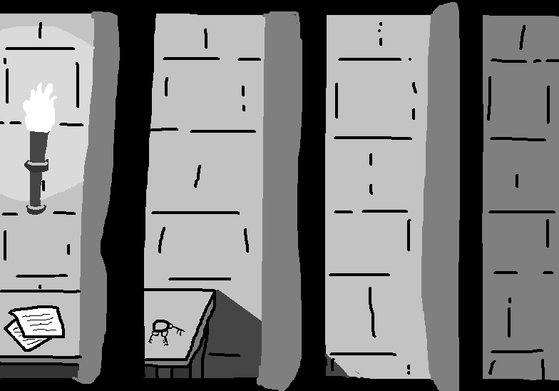 There is a table right below the torch. There is some paper and what looks to be a ring with a bunch of keys on it. Maybe those keys are my ticket out of here. But I doubt that the range of my Levitation is far enough to reach the keys.