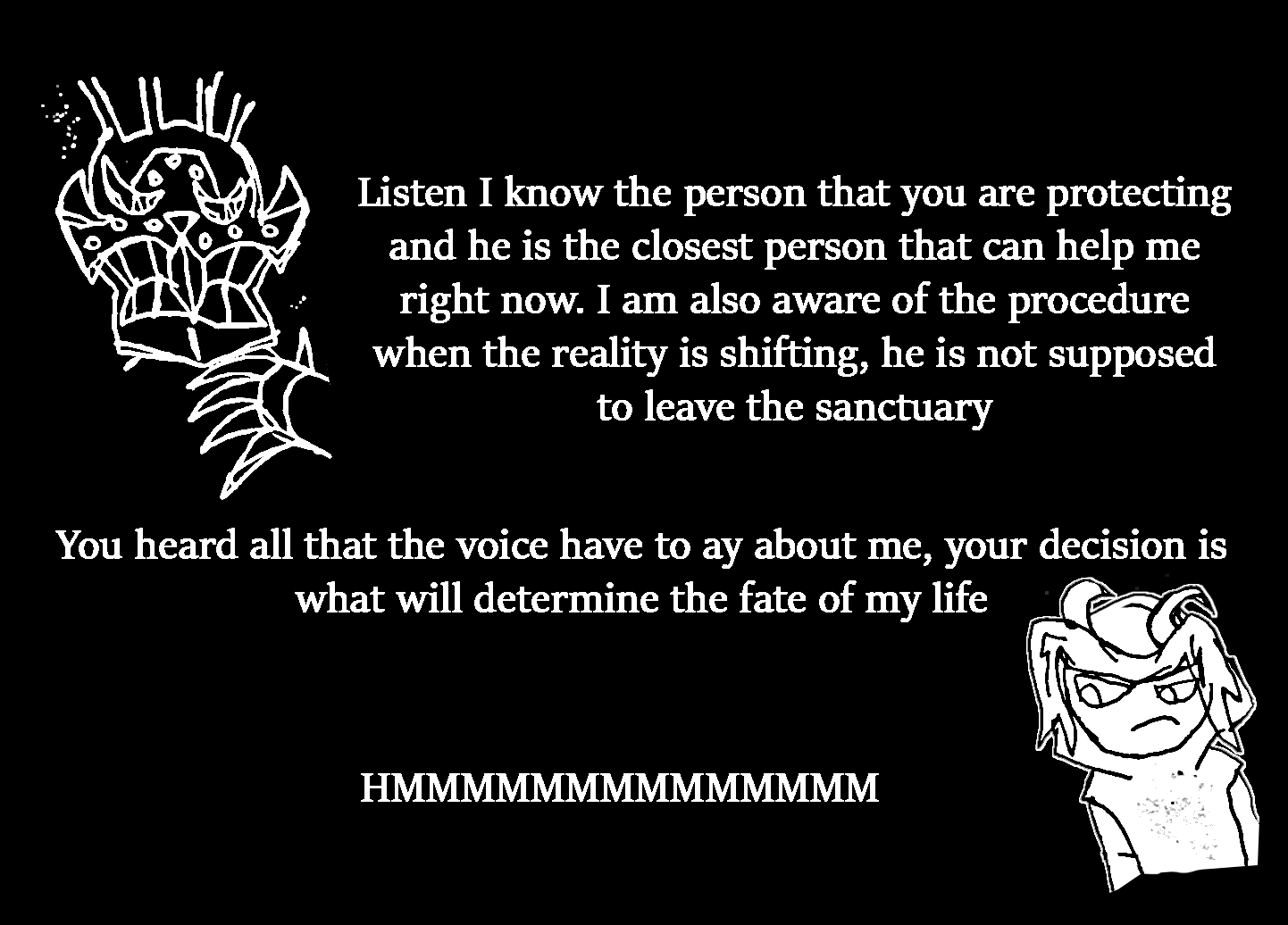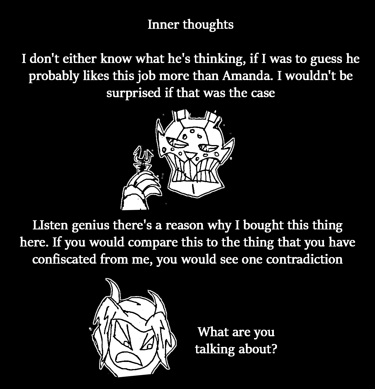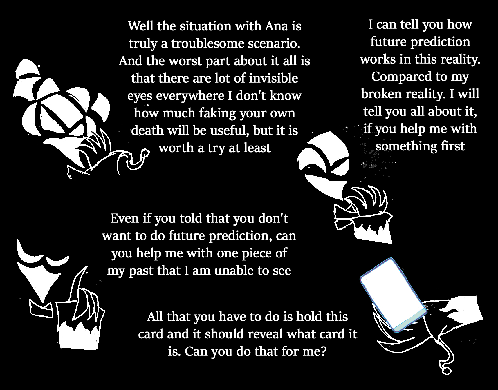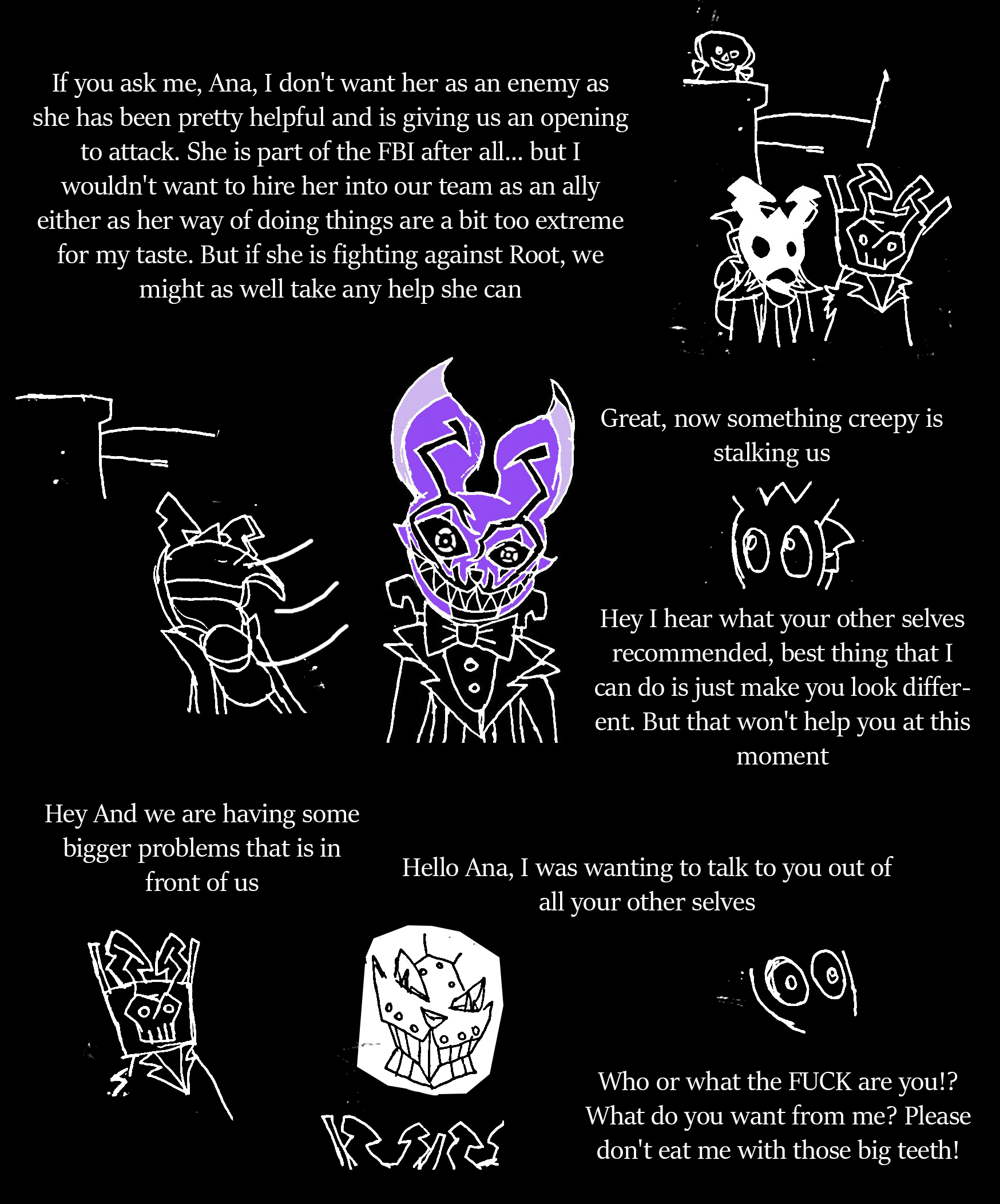 We met up with the FBI Laura, and we told her about the general that did everything he could to keep the army from fighting against the cult, she gave us the news that she activated 93's bomb. After we left, we were being stalked by someone, but before we could deal with it, Rabbot came up, and gave us a chance to save 93 if we could answer his riddle, or remove Ana's tongue if she failed. We unfortunately did fail, but Rabbot said the answer didn't matter since it was more of a test to see if Ana can respond in dire situations. I discovered I gained some of Falafaf's fortune telling powers, we discovered that 93's bomb is voice activated, and after exhausting all our possible canidates to help remove the bomb, we remembered that there was a certain riot control police officer in another dimension that may currently save her, and luckily enough, he knows about dissembling bombs. We are speaking to him through a weird receiver he got from a person who kidnapped him that was able to communicate with us, and this is where we are now. We are defusing a bomb with his help in some kind of dimensional hopping telephone.
