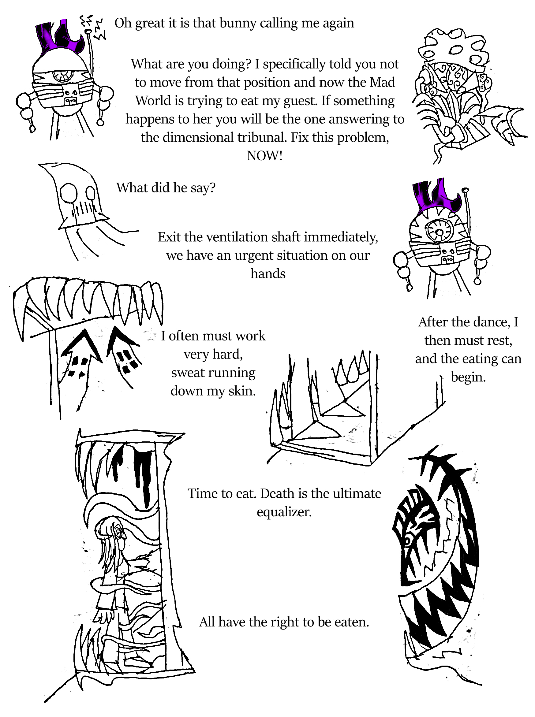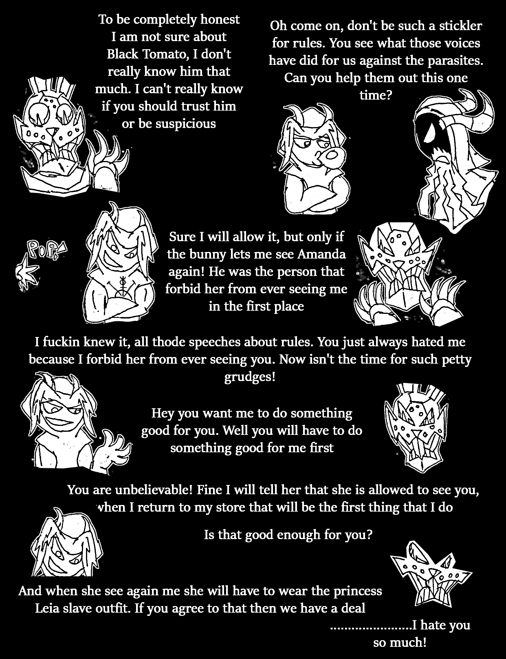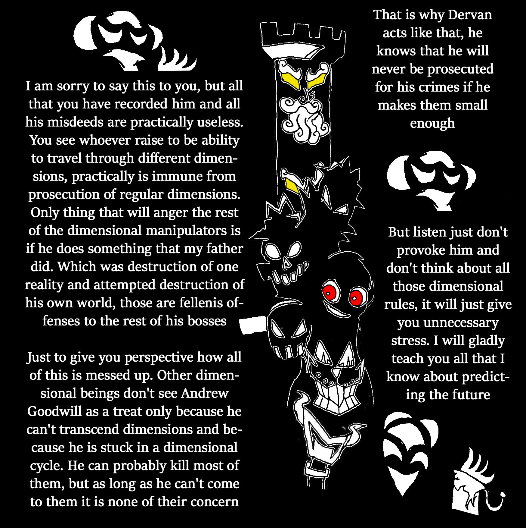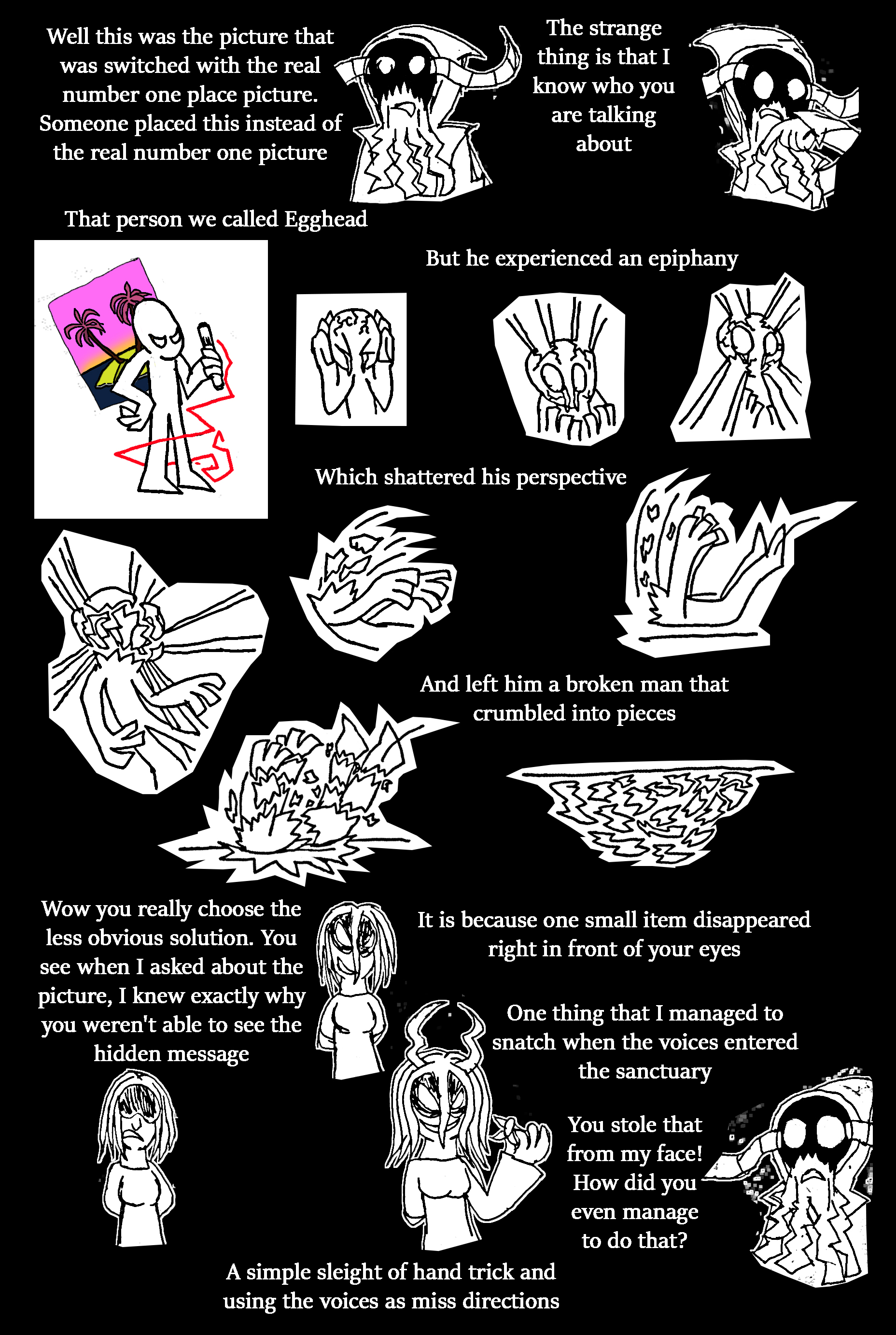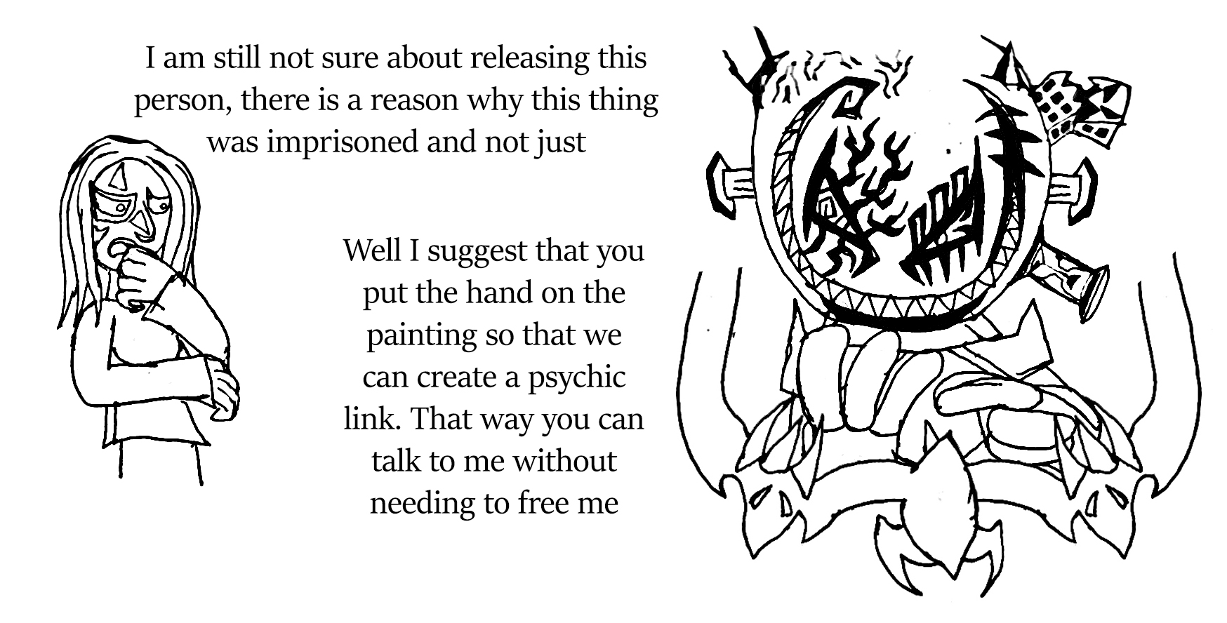 We met up with the FBI Laura, and we told her about the general that did everything he could to keep the army from fighting against the cult, she gave us the news that she activated 93's bomb. After we left, we were being stalked by someone, but before we could deal with it, Rabbot came up, and gave us a chance to save 93 if we could answer his riddle, or remove Ana's tongue if she failed. We unfortunately did fail, but Rabbot said the answer didn't matter since it was more of a test to see if Ana can respond in dire situations. I discovered I gained some of Falafaf's fortune telling powers, we discovered that 93's bomb is voice activated, and after exhausting all our possible canidates to help remove the bomb, we remembered that there was a certain riot control police officer in another dimension that may currently save her, and luckily enough, he knows about dissembling bombs. We are speaking to him through a weird receiver he got from a person who kidnapped him that was able to communicate with us, and this is where we are now. We are defusing a bomb with his help in some kind of dimensional hopping telephone.
