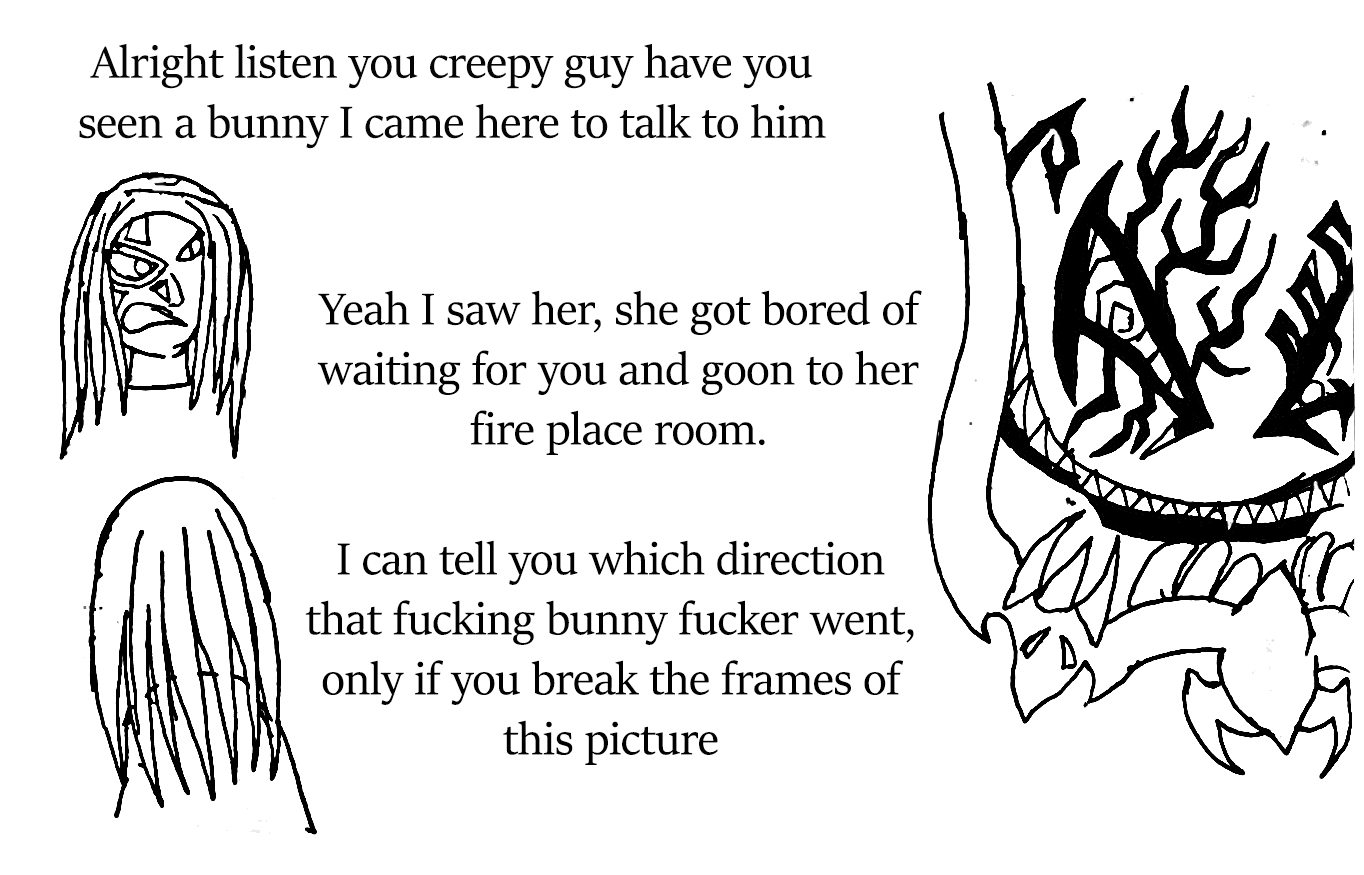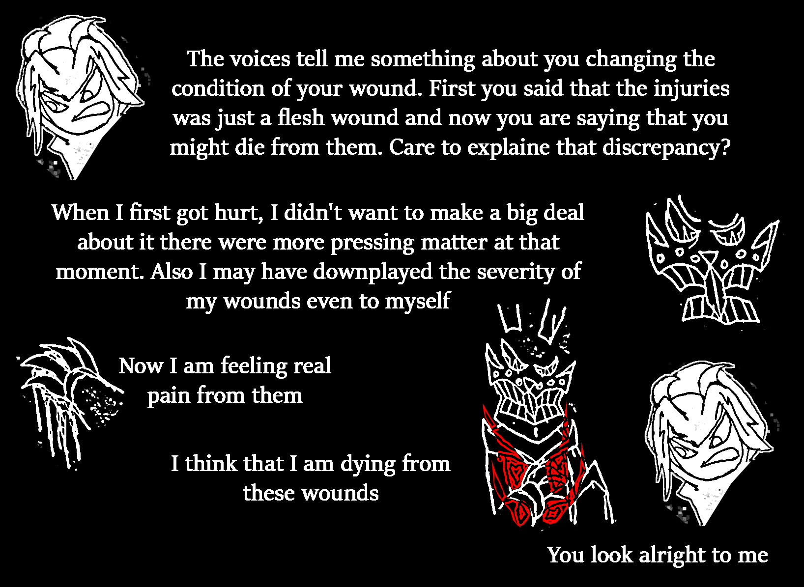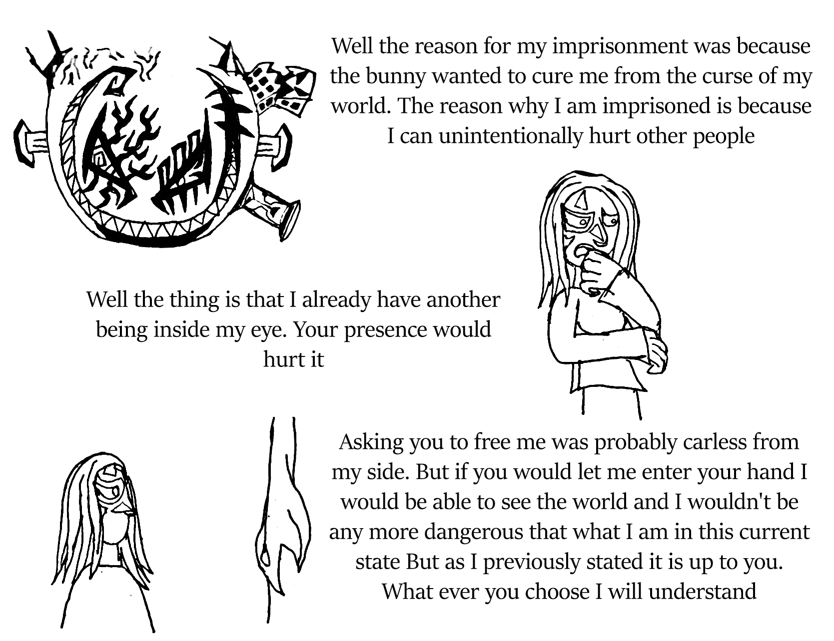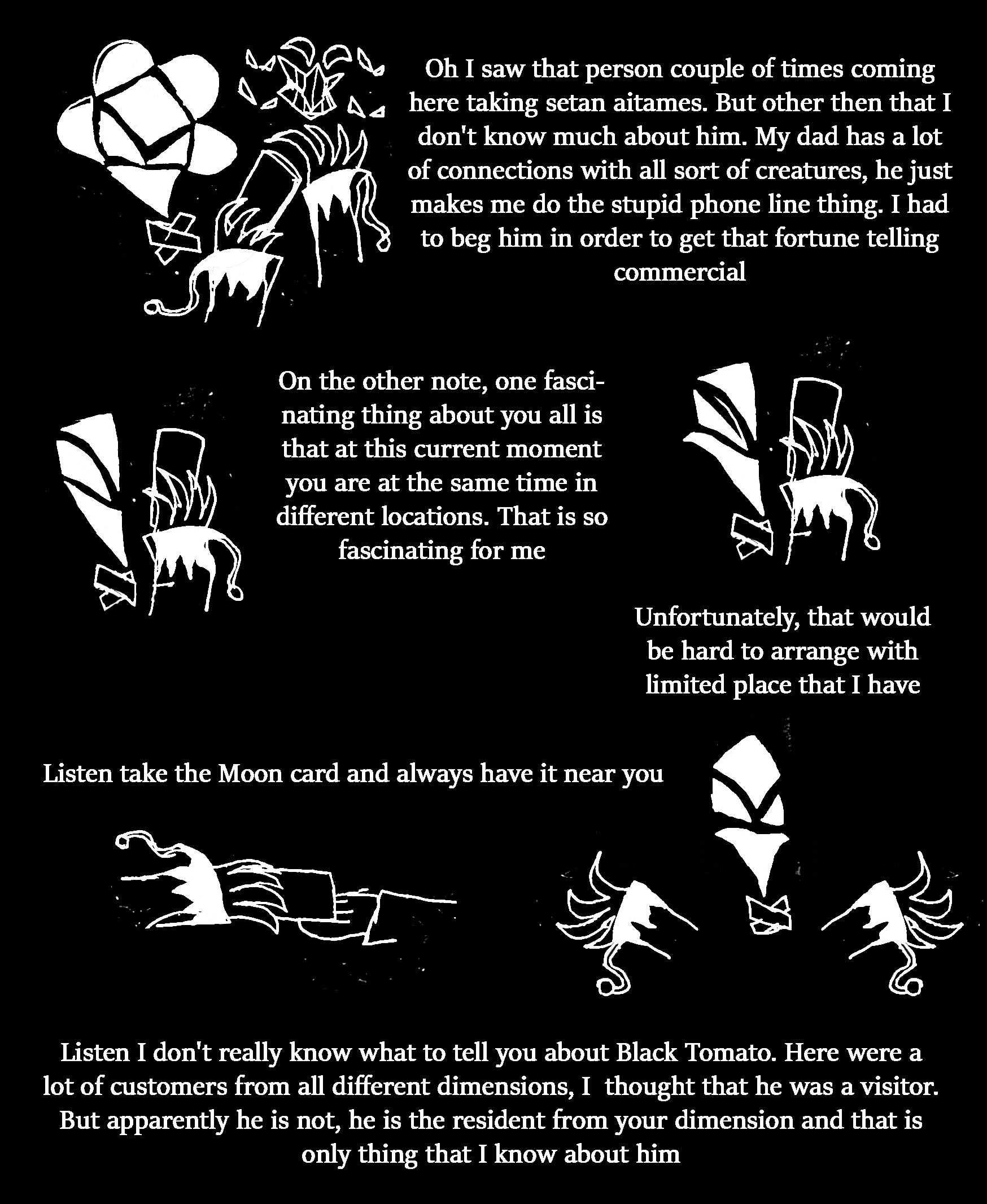 We met up with the FBI Laura, and we told her about the general that did everything he could to keep the army from fighting against the cult, she gave us the news that she activated 93's bomb. After we left, we were being stalked by someone, but before we could deal with it, Rabbot came up, and gave us a chance to save 93 if we could answer his riddle, or remove Ana's tongue if she failed. We unfortunately did fail, but Rabbot said the answer didn't matter since it was more of a test to see if Ana can respond in dire situations. I discovered I gained some of Falafaf's fortune telling powers, we discovered that 93's bomb is voice activated, and after exhausting all our possible canidates to help remove the bomb, we remembered that there was a certain riot control police officer in another dimension that may currently save her, and luckily enough, he knows about dissembling bombs. We are speaking to him through a weird receiver he got from a person who kidnapped him that was able to communicate with us, and this is where we are now. We are defusing a bomb with his help in some kind of dimensional hopping telephone.