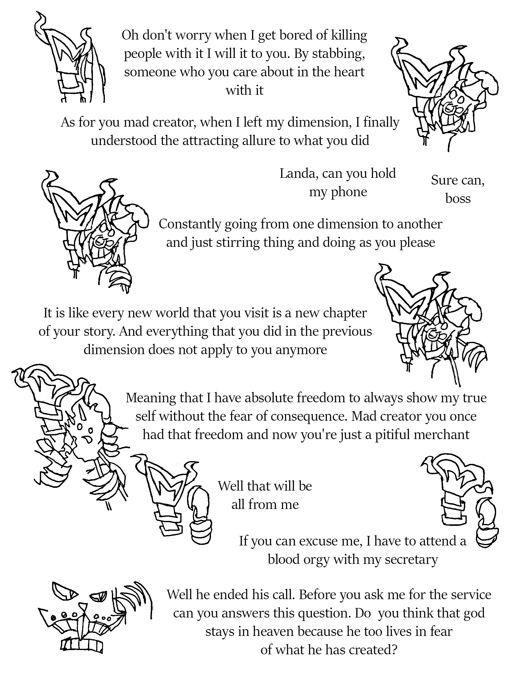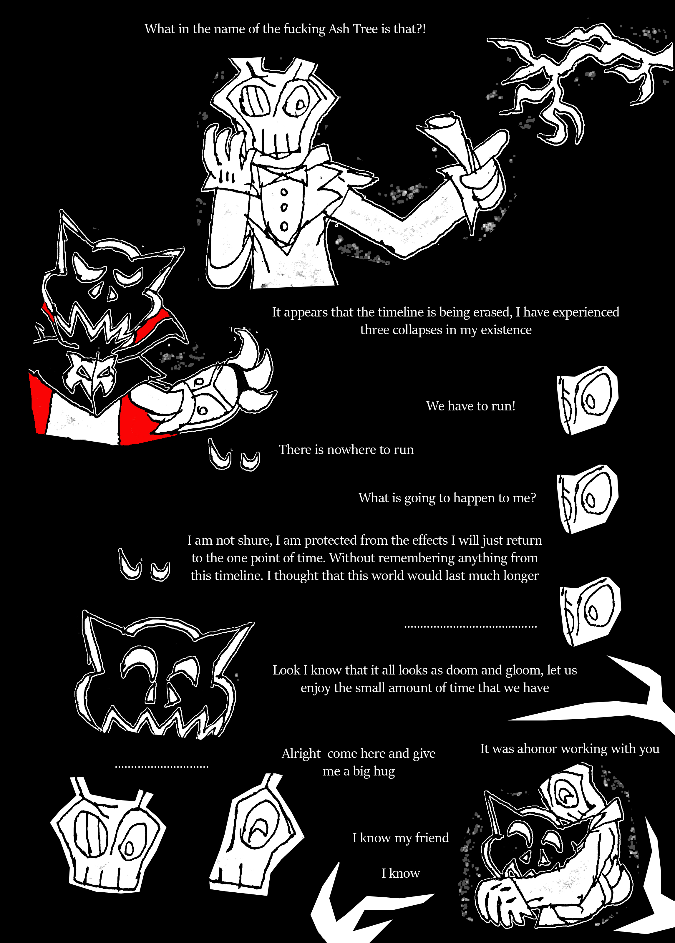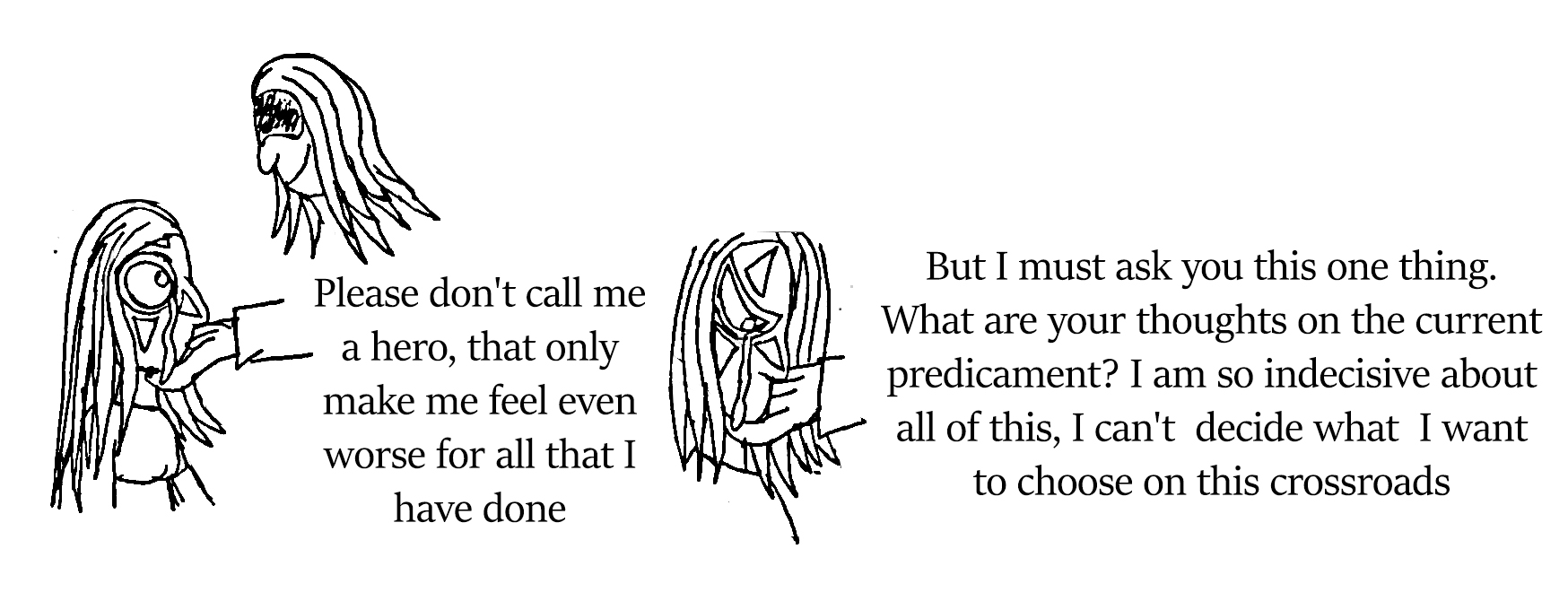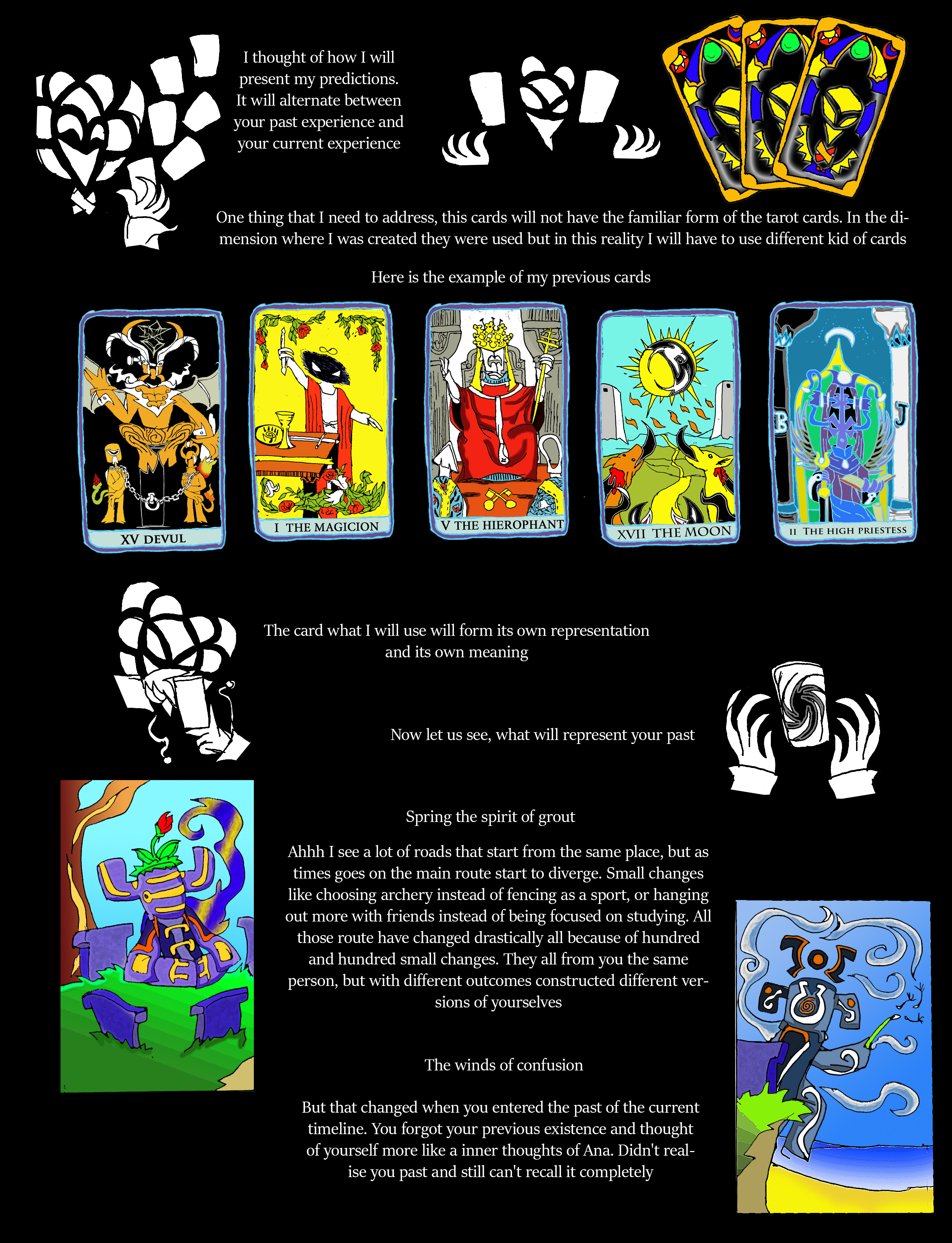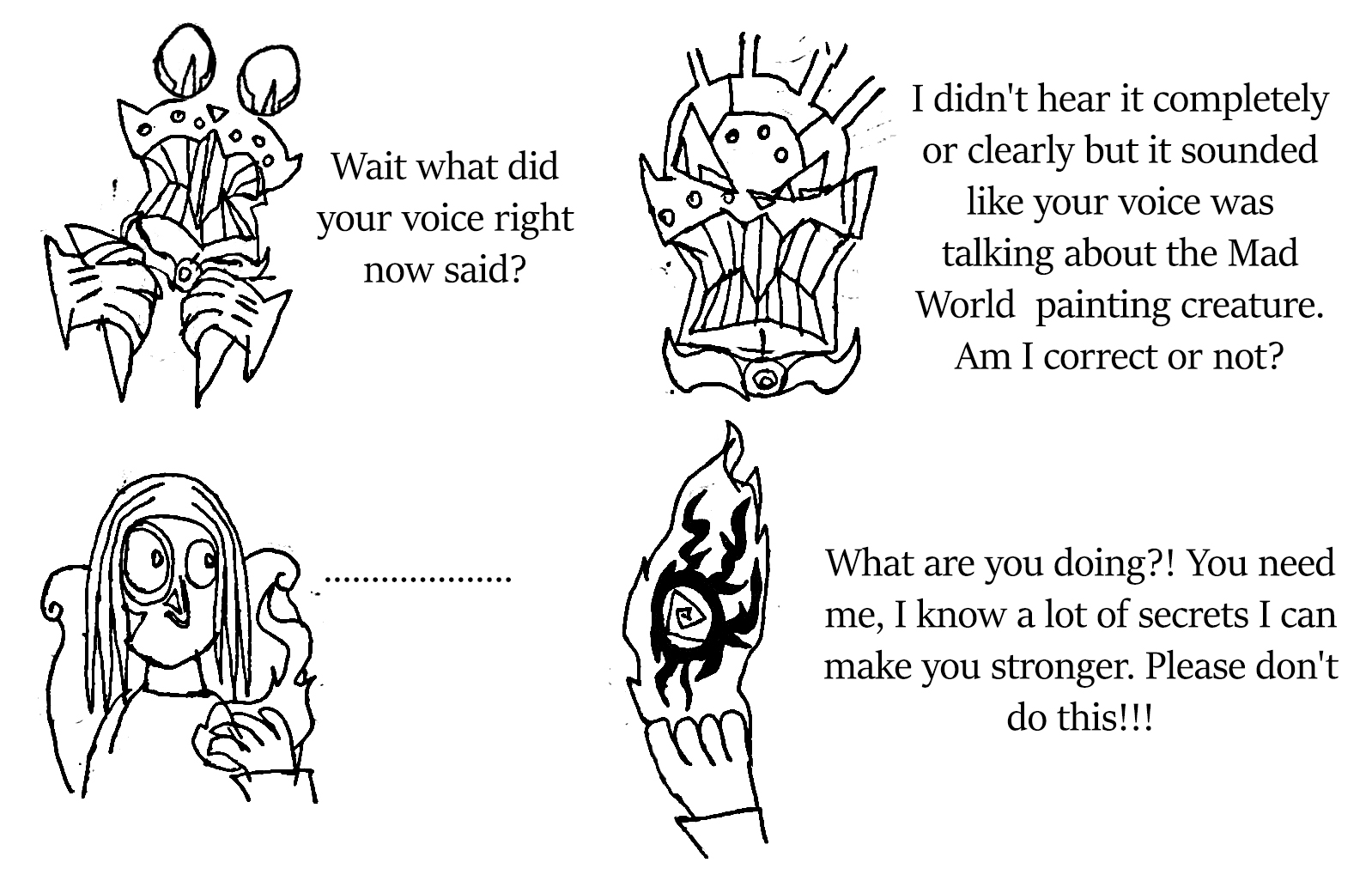 We met up with the FBI Laura, and we told her about the general that did everything he could to keep the army from fighting against the cult, she gave us the news that she activated 93's bomb. After we left, we were being stalked by someone, but before we could deal with it, Rabbot came up, and gave us a chance to save 93 if we could answer his riddle, or remove Ana's tongue if she failed. We unfortunately did fail, but Rabbot said the answer didn't matter since it was more of a test to see if Ana can respond in dire situations. I discovered I gained some of Falafaf's fortune telling powers, we discovered that 93's bomb is voice activated, and after exhausting all our possible canidates to help remove the bomb, we remembered that there was a certain riot control police officer in another dimension that may currently save her, and luckily enough, he knows about dissembling bombs. We are speaking to him through a weird receiver he got from a person who kidnapped him that was able to communicate with us, and this is where we are now. We are defusing a bomb with his help in some kind of dimensional hopping telephone.