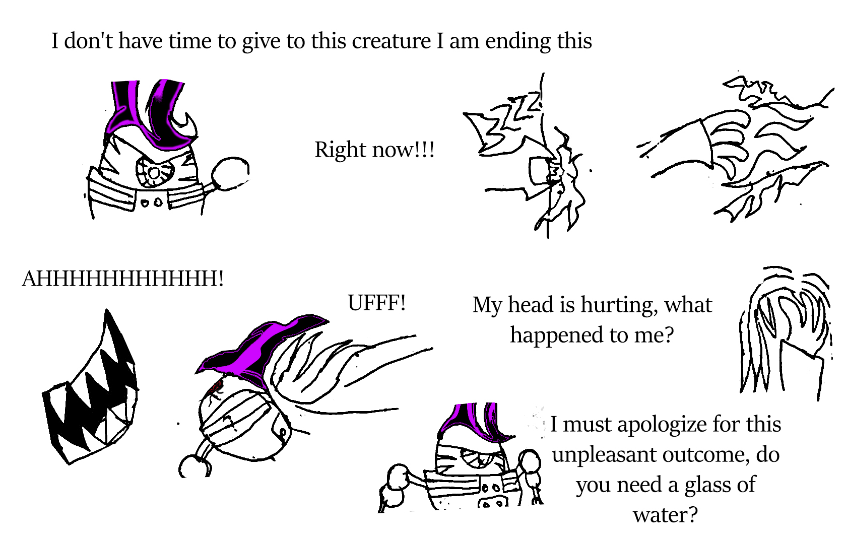 the other team was complaining about interference, or stuff like that, and it was decided it would be settled in one more match. We challenged Rosaline, they challenged us. Eventually, we won, just barely. Rosaline acted like a sore loser and try to injure Ana after we healed her, but Godfrey and Boxhead stopped her.