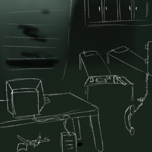 The first floor of this building seems to be all one room. Around you, there are several armchairs like the one you used to barricade the door. The window next to you is the only one, and the glass has long since been smashed in. In front of you is an old, wooden desk with one leg broken. A dinosaur of a computer sits atop it, the monitor leaning precariously to one side. God, this thing must be from the 90's. It's practically your age. A few similarly old click pens are scattered across the ground. They probably fell off the desk when the leg broke. There's a landline phone hanging off its hook on the wall.