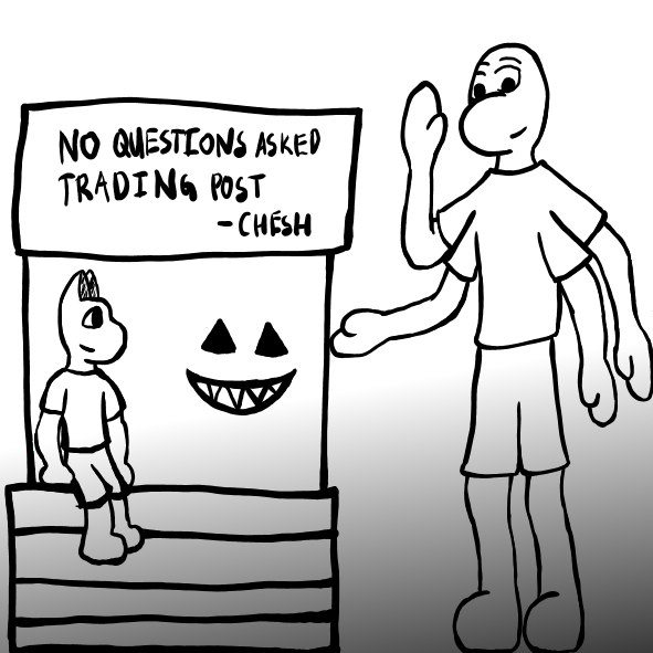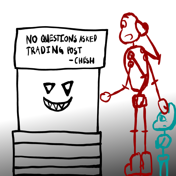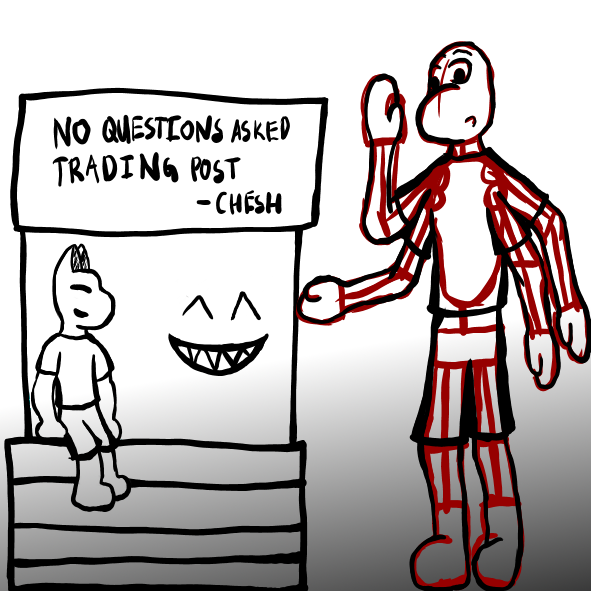 "Oh, and by the way," Chesh says, " I threw some pants into the deal, so you're not arrested for indecency. And be sure to un-equip your sketch layer once you get those outlines on, or you'll just look silly."