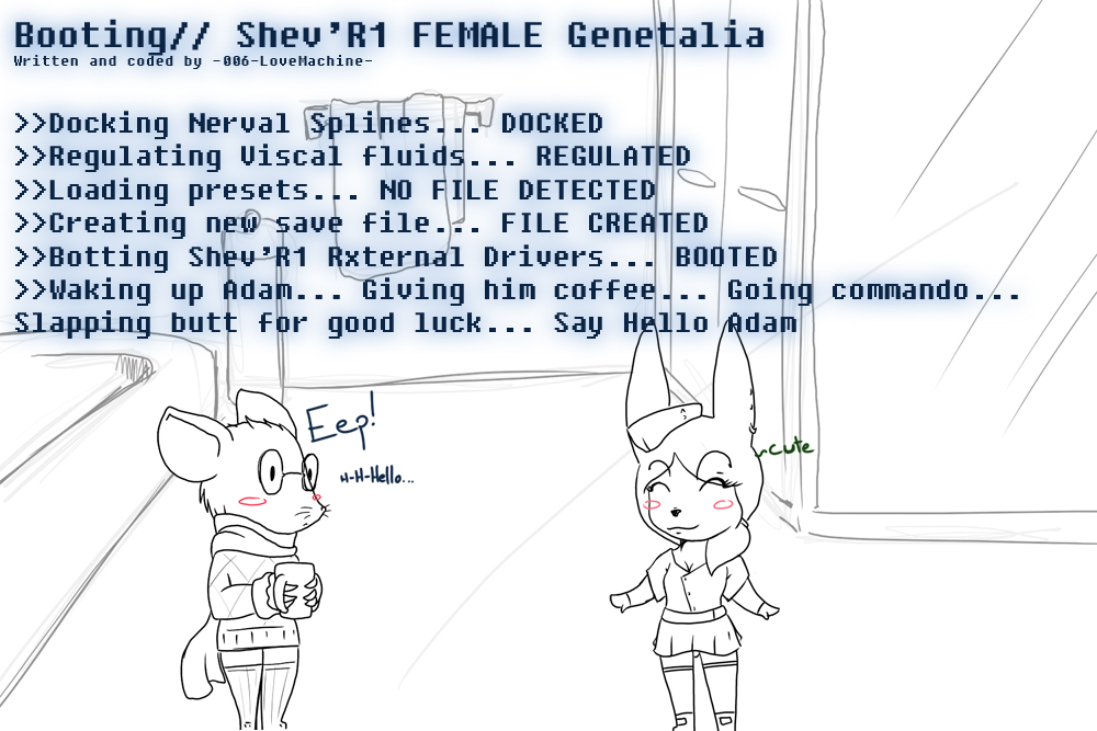 Aalos - (Oh, I just got a idea: What if we switched over to researching the female side of social and sexual interaction rather than male? 006 has already worked the male side of sexual research so much that he's already picked all the low hanging fruit and then some. And also, since the horrible demise of our sister 003 there haven't been female-by-default TG models, so this is a research area that likely hasn't been explored nearly as much. We could work to be the female counterpart to 006, one day designing a female equivalent to the 2ndfall. ...And then pay Love Machine a visit.~)
