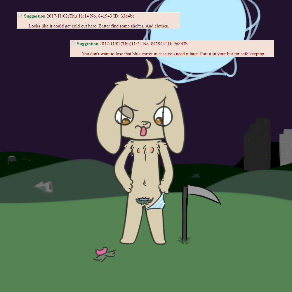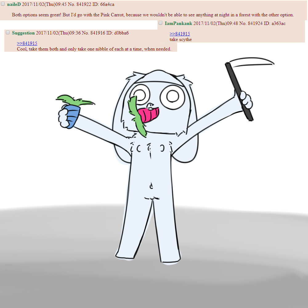 >The midget puts down their scythe and holds out their hands, 2 carrots appear floating above them, offering them to you, you also notice that you could possibly take his scythe now but thats probably a bad idea since they are staring right at you