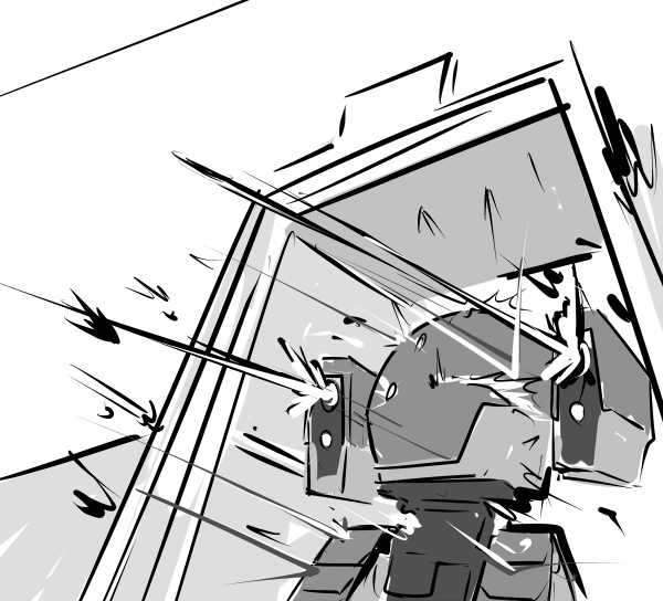 Instantly the four of you launch into action: breaking from cover and pushing forward. Cricket and Zombie vault the low barrier around the building while you cover Echo’s advance. Cricket slaps a breaching charge against the wall and shouts “CLEAR!” before the shaped explosive punches through.
