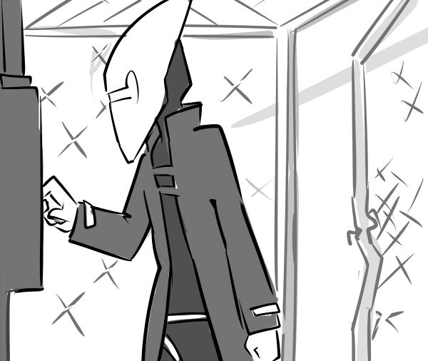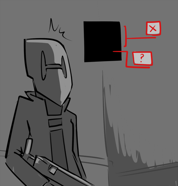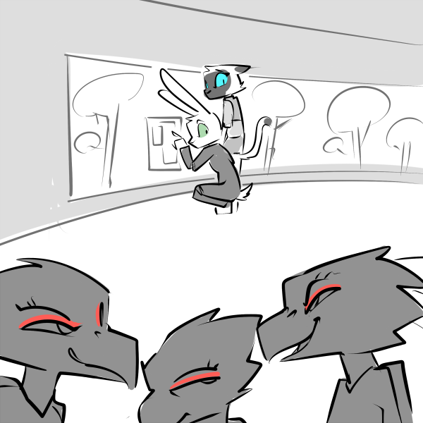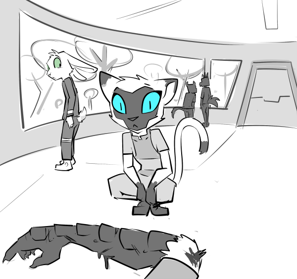 They send you back to the common area. Everyone else is gone: judging by the time, they’re at lunch. You sit with your back against the wall, underneath the starburst of damaged pixels and listen to your stomach growl.