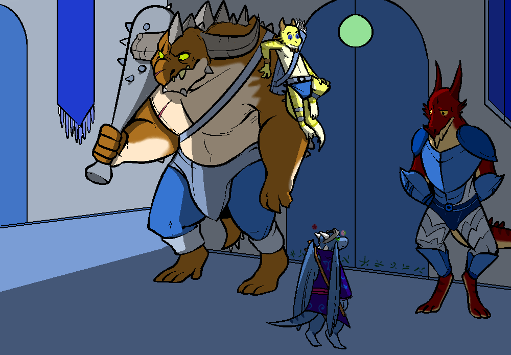 "Well, Fraunx. This is a very important job you've gotten yourself. My daughter is in here, and you have to make sure no one dangerous gets to her or the others inside." Aataz grinned, giving the draconid a wink. "Or else I'll have to turn you into a newt."