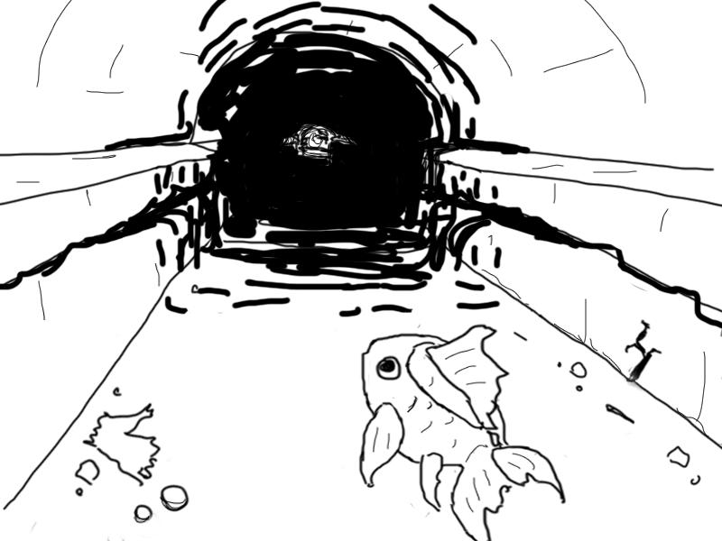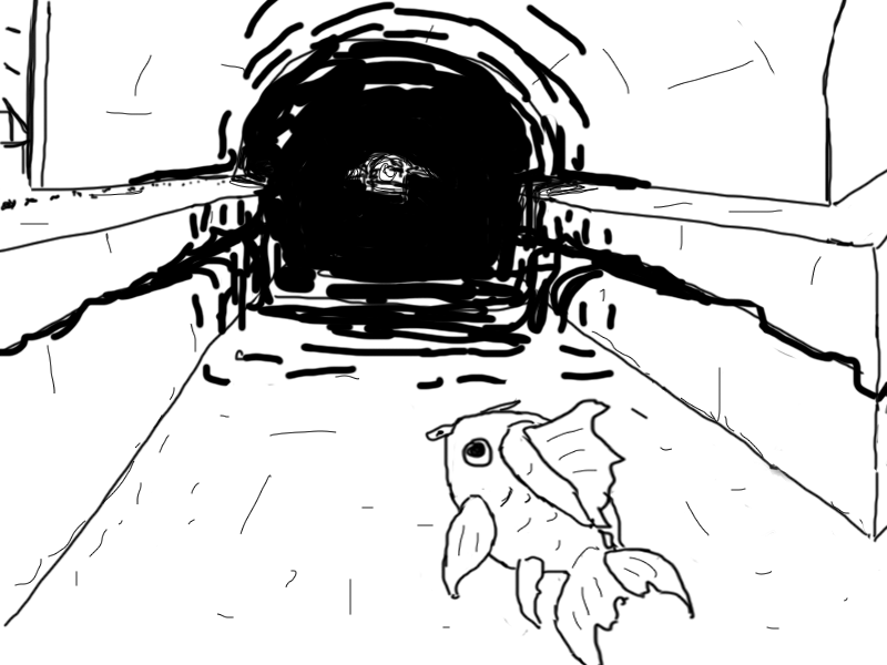 Your new fishy senses alert you to three stinuli. There is some kind of land mammal scritching around to your right, a couple of fish swimming around further down the tunnel, and some presumably human trash submerged in the tunnel to you right.