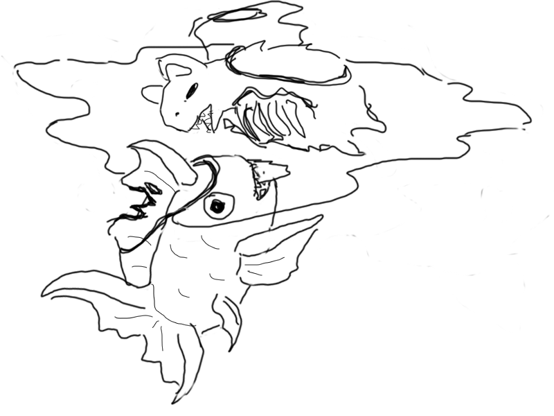 You drag the creature back into the water with you. This time, you're able to use your teeth to hold on to it. The scritchy thing struggles but you've got a good grip at the back of its neck so it can't turn around to bite you.