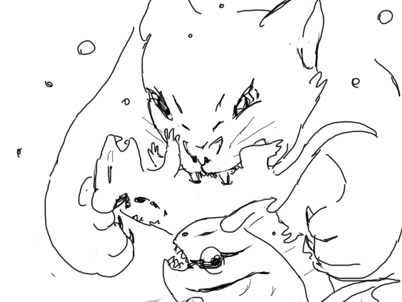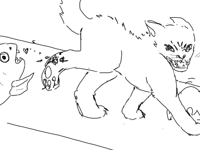 You drop the dead food and get ready to- aaAAAHHH the cat claws the left side of your face and grabs the food before you can muster an attack.