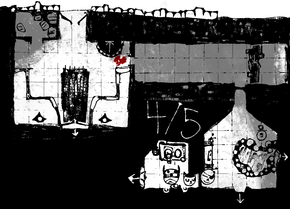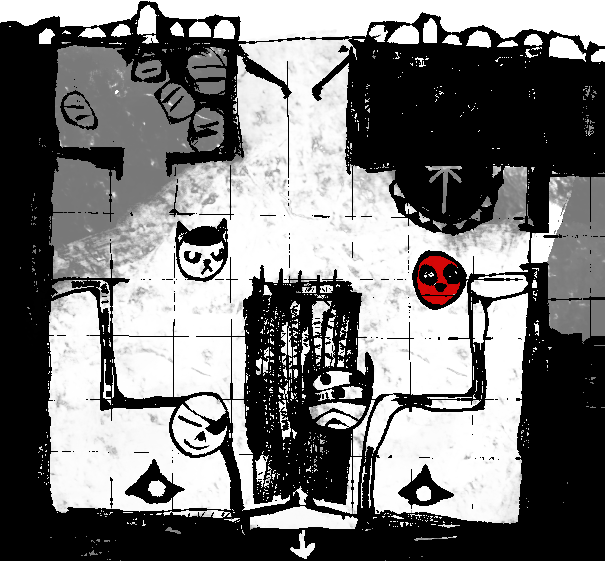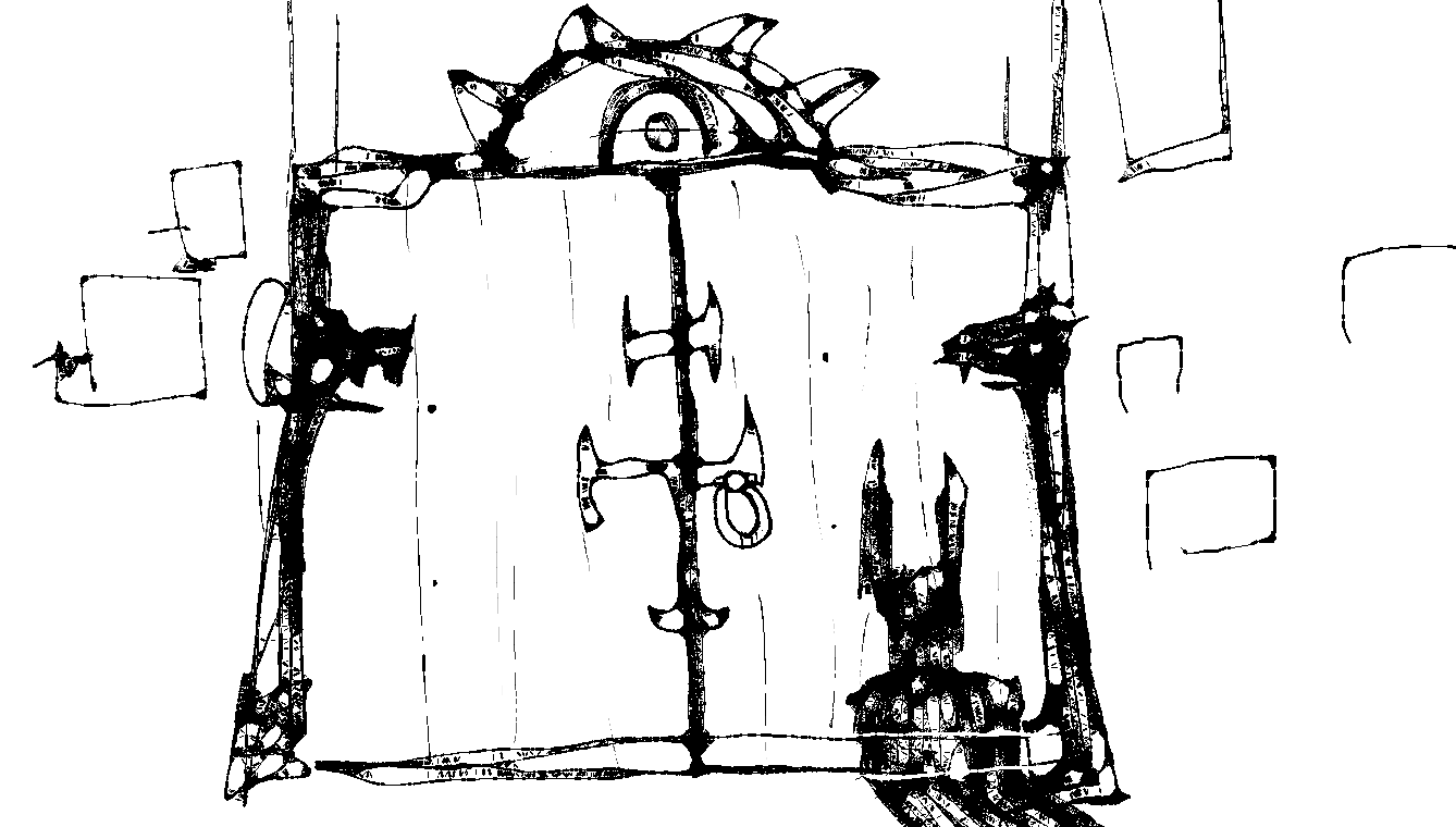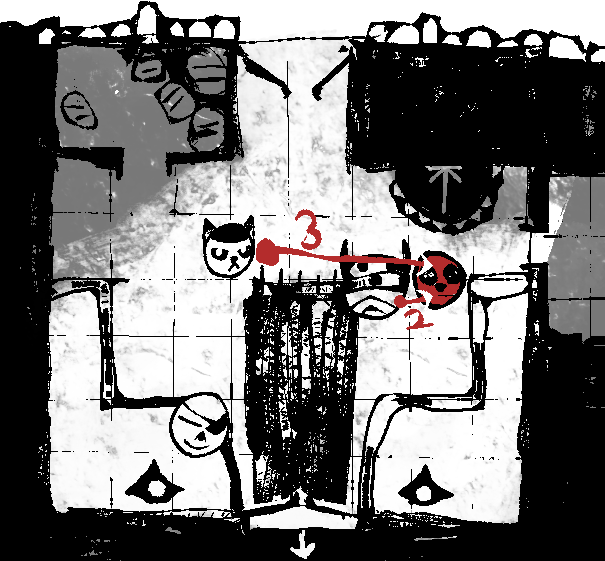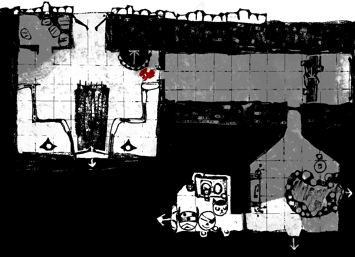 >Two chest-height raised platforms on either side of the southern door, with two black iron candelabras atop them. These are unlit.