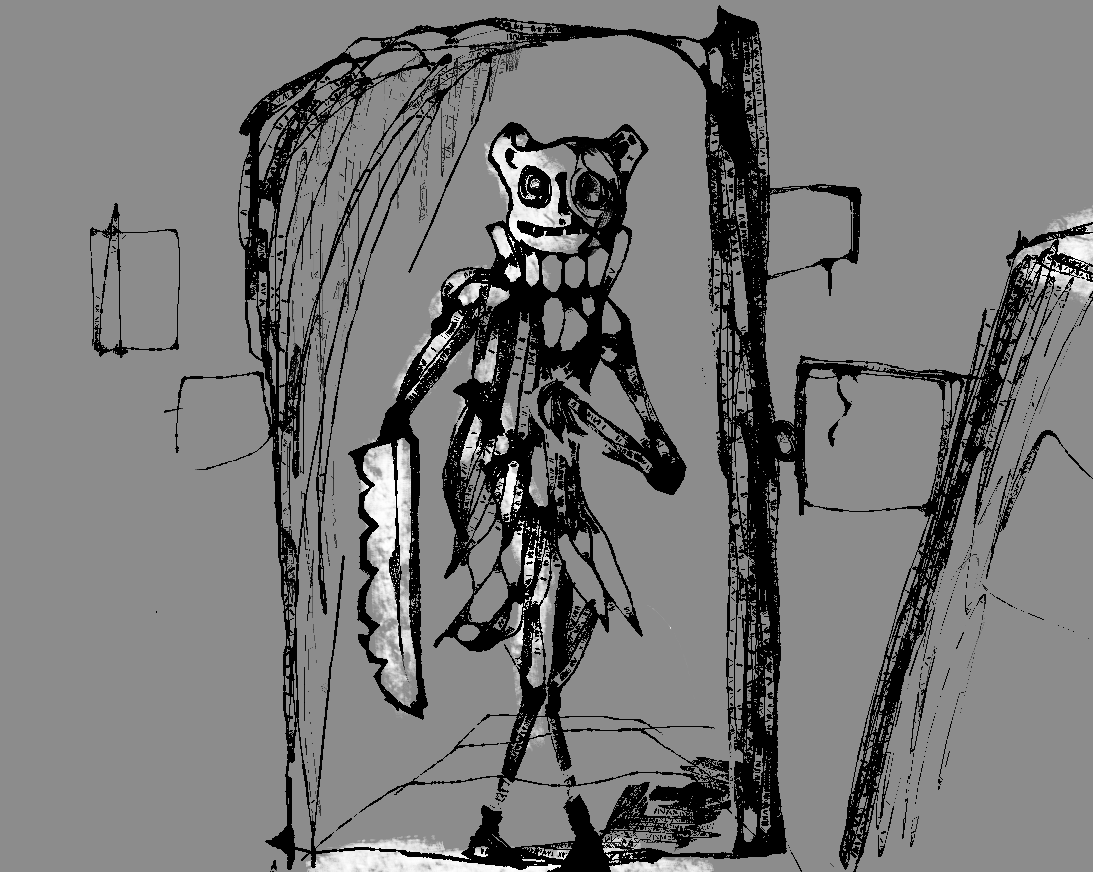 >The room is drafty and chill. It's lit by the open sky flooding in through the front door. It contains: