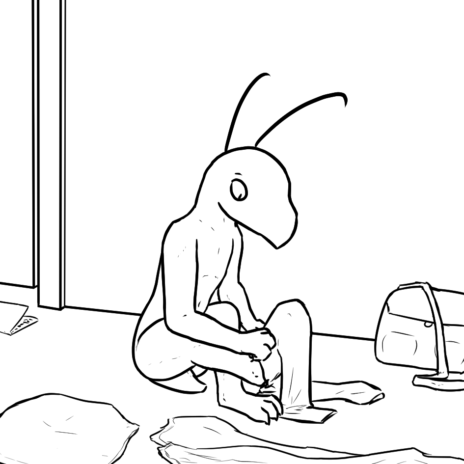 Soon enough, he takes me around to a far corner with a table where Daiďa is sat with another šekini, reading a book to herself. The other šekini was the first to notice me though, and directed her attention to me.