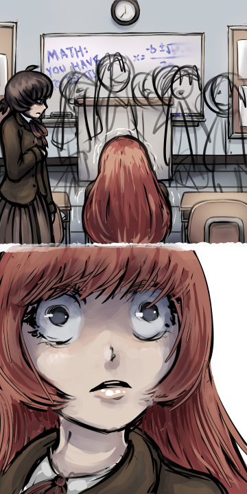Not to mention you banged your ass on the ground outside school and that really stung. You don't think you've ever felt pain in a dream before. And you've gotten weird about "what if my whole life is a dreaaaam" shit a few times, you know how to test whether you're dreaming, as stupid as that is. If this was a dream, words and numbers and stuff would be changing when you looked away - that's almost always how it works. But the writing on the whiteboard, the drawing that says "lying cunt" on it? Those never changed at all.