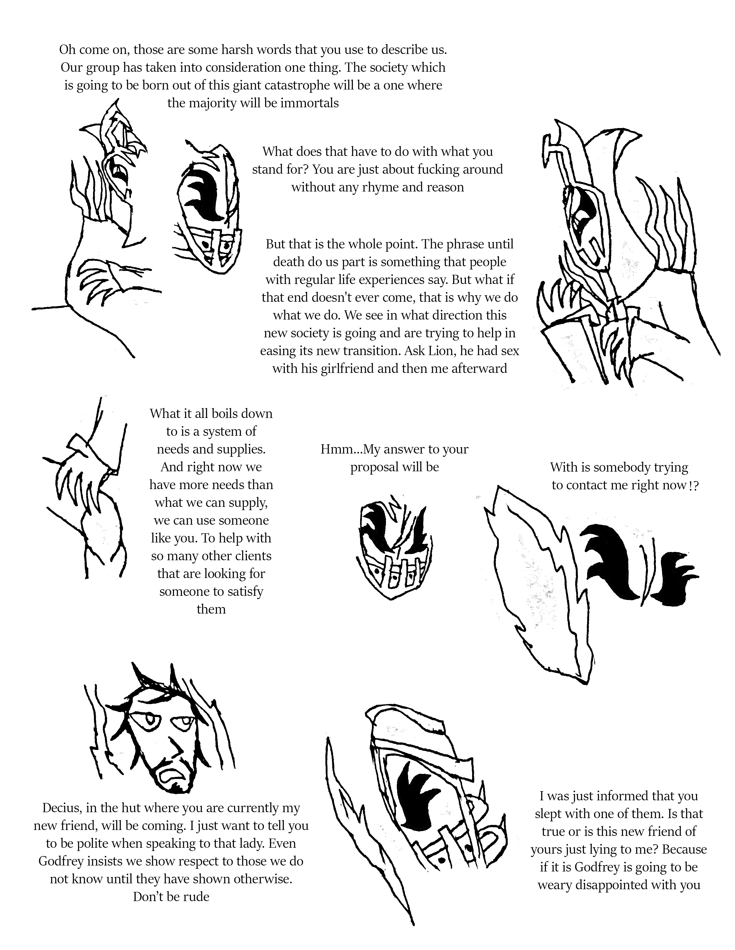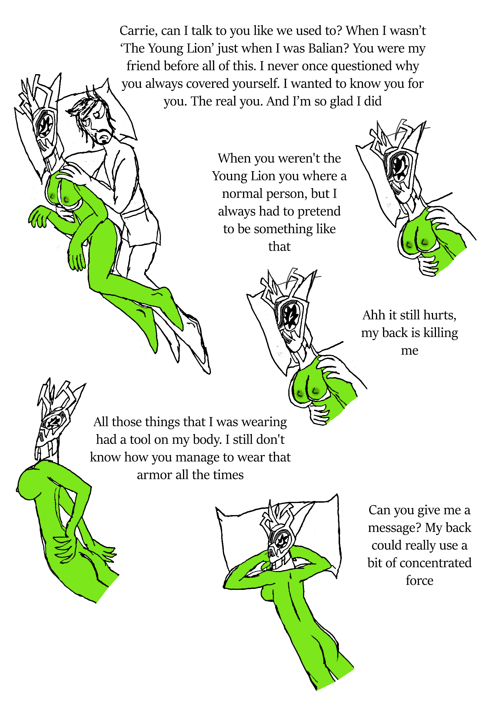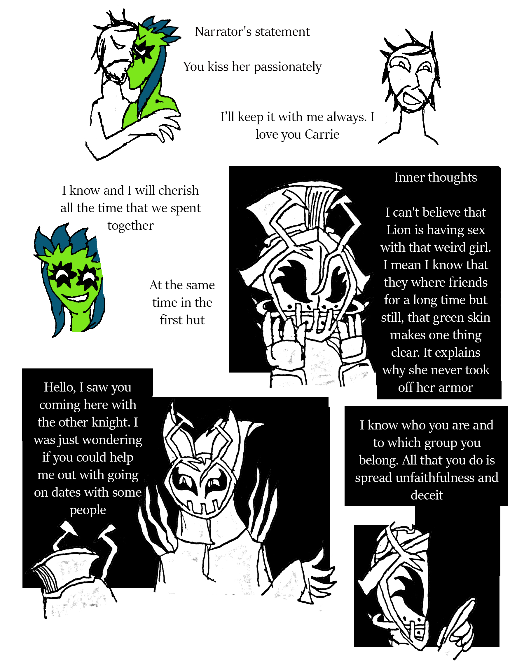 As for your proposal... It’s a tentative yes, but I can’t let go of vows to the Cross Ash. But I’d like to return to my purposal however, I’m gonna let you in on a little secret, I think Godfrey actually finds your leader to be... very attractive. I’ve seen the way they talk to each other and through the bickering and arguing, you could almost cut the sexual tension with a knife. I think he’s been acting the way he has because he needs to keep up appearances. But I once saw him composing a letter to her asking if she felt the same way then destroying it. Just give it time for now. After this trial... IF we make it through this trial I’m sure we can find some common ground. Godfrey likes helping for the good of the people, your Leader does too, I’m sure we could set some Knights up with dates.