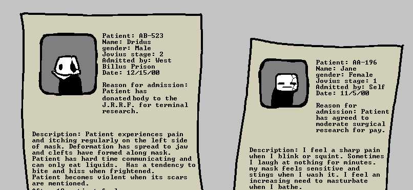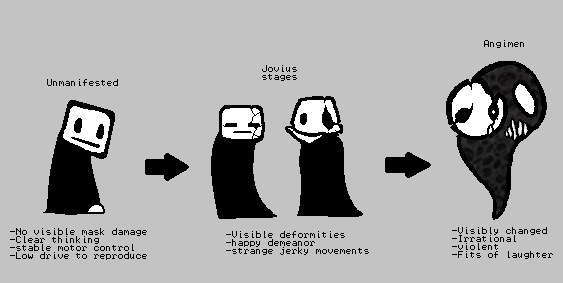 Symtoms include: speech impairment akin to a child's, Clefts or cracks in mask, Stiffening or hardening of mask, Lowered cognitive ability, Happy demeanor, Seizures, Attraction to water, Pruning or softening flesh, and Leaking. These symptoms show up and get worse over time typically happening in 3 stages. Jovius will progress more quickly with the more happiness an infected Billuden experiences. AB type Billudens are more prone to manifesting Jovius than AA types."