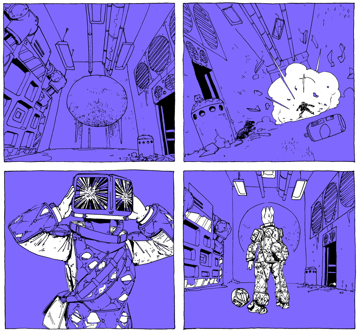 1- As she soldiered forth into the empty room to do a closer inspection, her battered protective suit began to shred off of her. Little pieces of punished impact foil falling from the burst quilting like confetti, and the heavy quilted sections themselves fell away, taking the rest of the bluish foil with them piece by piece.