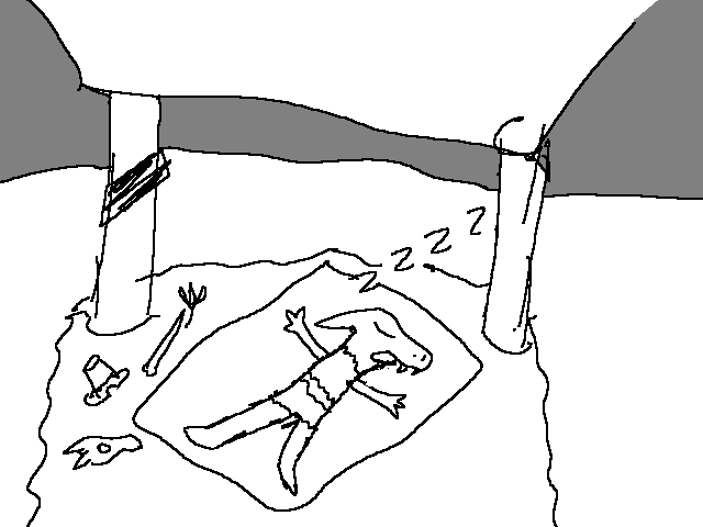 The next morning, Driblis was unable to determine gender. After that confusion, Jibblet accompanied Driblis out to the forest nearby, in the hope of combatting some elves! After some travel, they chanced upon a bear. The bear was eventually defeated without too much injury to the kobolds. After some work, the bear was skinned, butchered, and cooked. The skin has been crafted into two rawhide backpacks and a fur top for Jibblet. The kobolds camped briefly. Arriving at the forest, they spent some hours crafting a pit trap, and meeting Tomifliblin, a one-eyed cat.