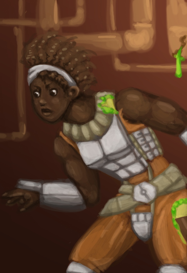Tracy is now on the clock! While the ship is still under an atmospheric force-field, losing her armor is unsafe. The longer she stays in the engine room, the more her armor will dissolve and the greater safety risk she takes. What will she do?