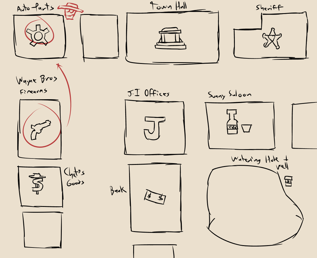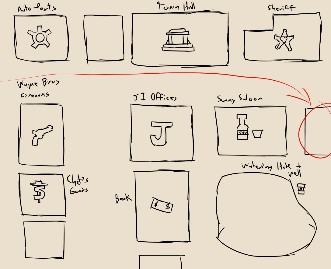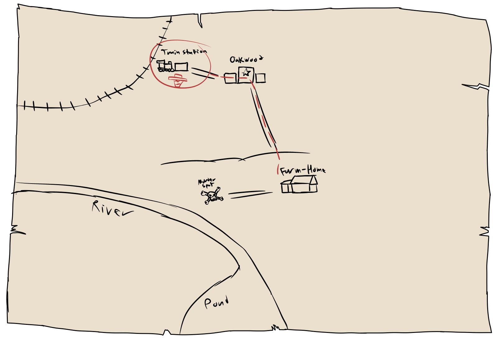 You enter the main road of Oakwood, represented by a map you've been sketching to keep track. There are only really several notable locations in town you can think of.