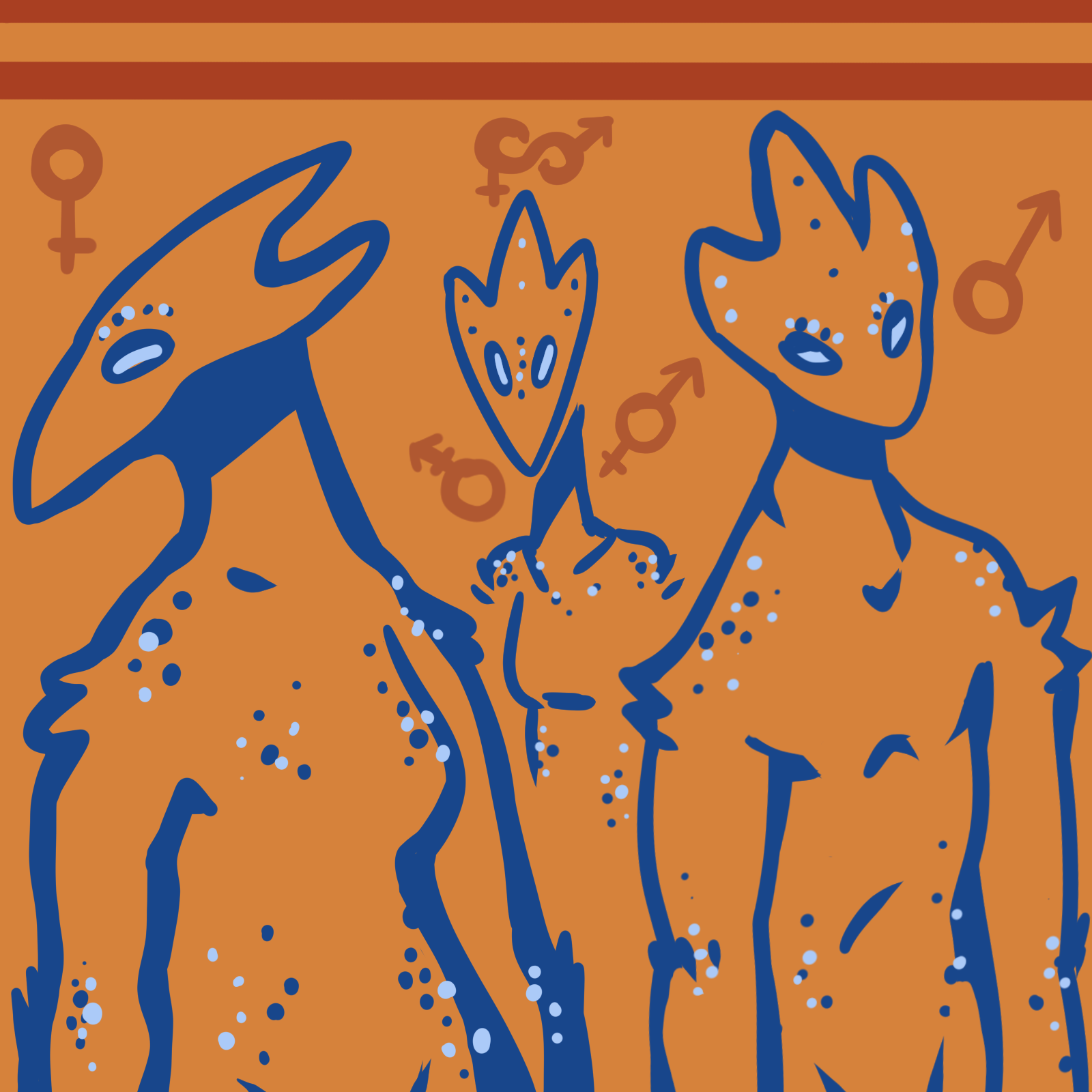 Center: Intersex/Ika-Dra. In a state between the two, displaying whatever characteristics the individual wishes. Considered a sacred, meditative state of being. Reaching and maintaining it is difficult but grounds for celebration. Will use neutral pronouns by default.