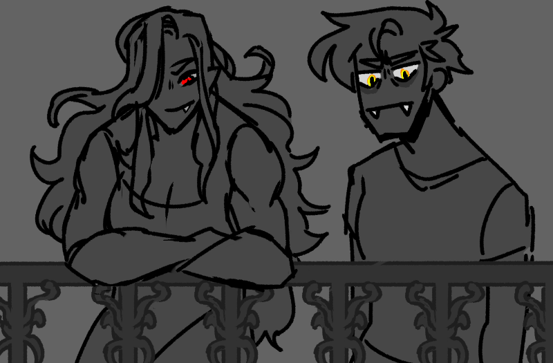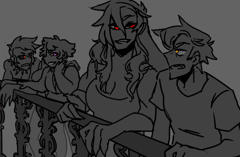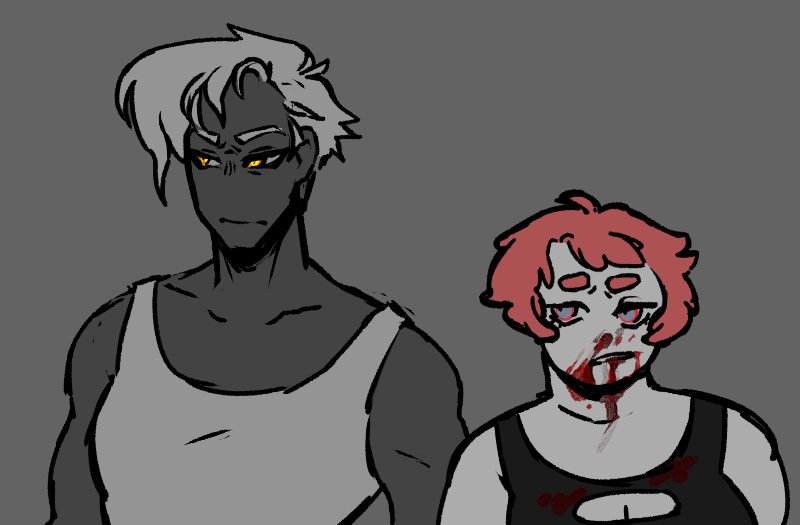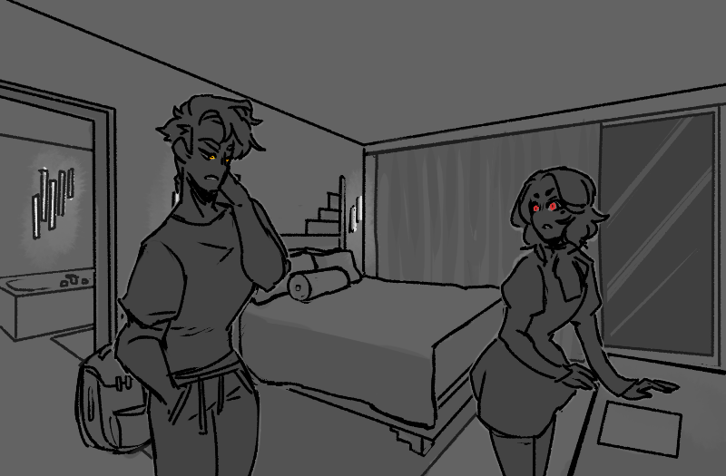 “Come on, let’s just get out. Stairs’ll be faster.” Strip grabs her hand and pulls her out into the hallway when the elevator slows to its next stop, leaving behind the grid of little glowing buttons, and they hear the guy who enters after them groan behind the closing door when he turns around and sees the carnage. That makes Strip laugh even harder, and they’re both barely paying attention as they sprint up the stairs until they finally reach the floor the shared room is on.