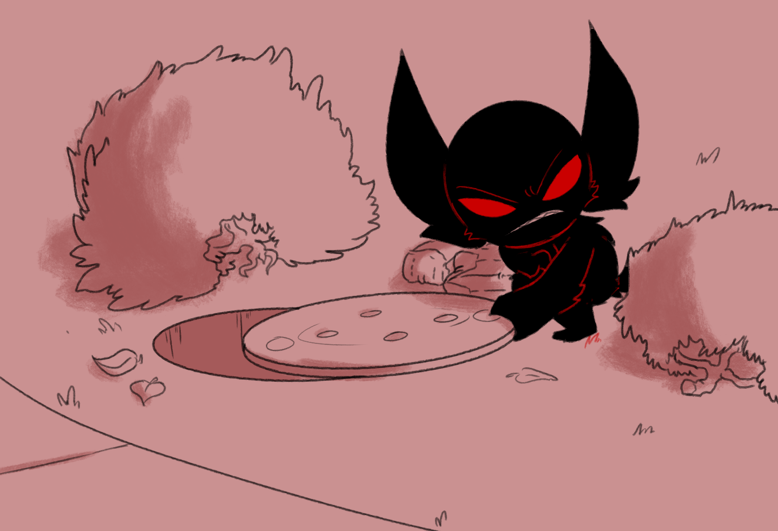 The imp's body is lined with stitches and seams, some bursting with cotton. It's eye stare's unblinking, upon closer inspection it's a painted glass eye. The imp is dressed in a tailored and patched suit that looks like it's made out of the same material as the bolts of cloth lying around the room. Delphi's stomach starts to turn.