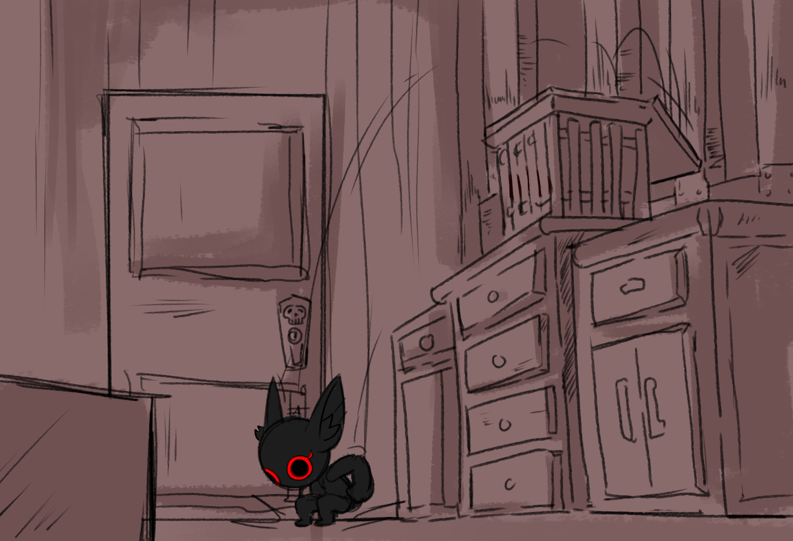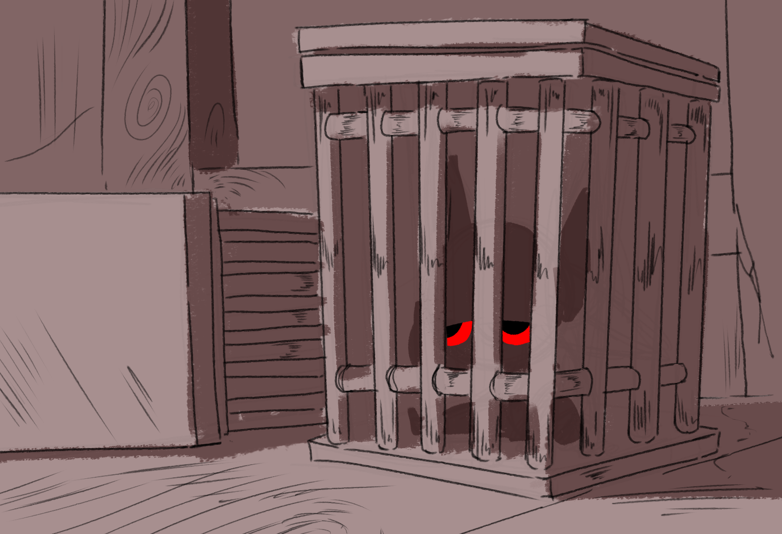 Delphi stretches an arm up grabbing the bars of the cage and lifting off of the shelf. The smell coming from the cage is fetid, but Delphi brushes it off as a captive not being treated well. As she places the cage carefully on the ground to open to lid she doesn't seem to notice that the cage wasn't locked like hers was. She reaches into the cage to pull out the captive, now seeing that it's an imp. When Delphi touches the imp she notices something is very wrong, the imp's body is oddly cold, stiff, and still. Once the imp is completely out of the cage Delphi and in the light Delphi jumps back in shock and disgust.