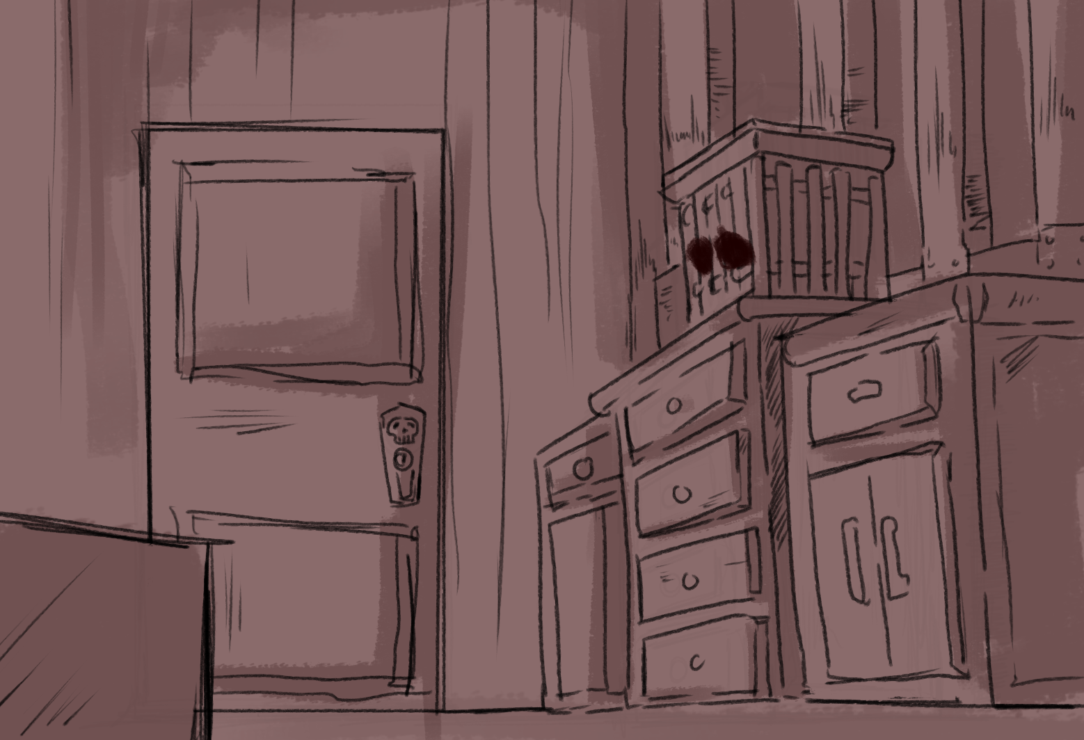 Listen at the door then check to see if it's locked. If it is, start searching the room for the key. ...wait why would the key even be in here