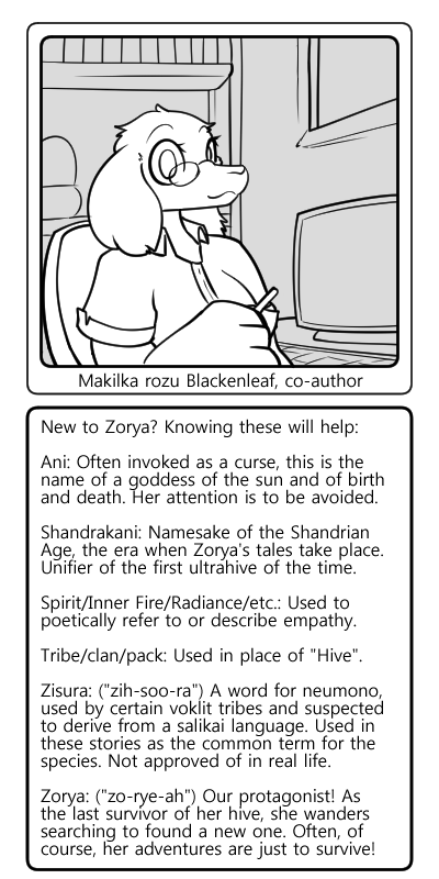 We resort to technology, then! Why not? What you’re about to read is what you might call a digital remastering of Oceans Uprising, originally released in 91 a.w. as an actual for-real paperback choose-your-adventure book. You won’t need a pencil and eraser to slowly destroy the inventory page with, and you won’t need to turn to page 103 from page 7 while sneakily keeping your finger in place so you can turn back if you didn’t like what happens. Whatever device you’re reading this on will substitute for paper pages. More than that, we’ve made the experience far more flexible! With recent advances in creative writing AI, plus several long weeks of training and input by the original authors and other members of our hive, you can forsake the options we’ve given you and try to add your own takes on where the story should go. I can’t honestly say I hope the AI will be as skilled as we are, but I do think you’ll enjoy it. Keep in mind, though, that this still isn’t really a video game. Zorya is your protagonist, and she has a will of her own. If you’re a fan of hers already, you’ll be able to guess the sorts of things she will and won’t consider doing.