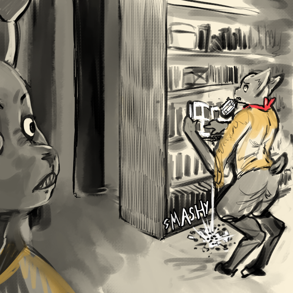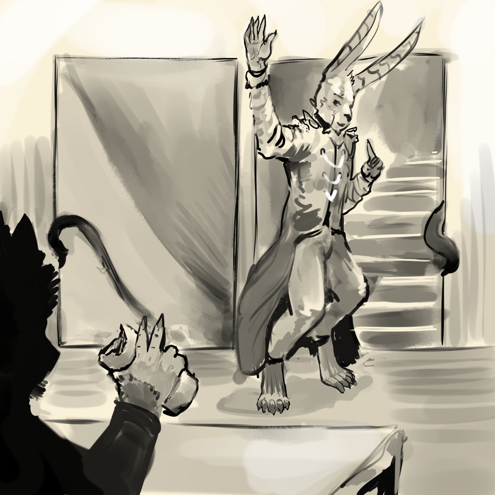 “It’s not dusty, it’s cleaned… nevermind.” Recalibrate. Get back on topic. “I have distressing news to inform you of, but first my martinets need assistance. They’ve been, well, affixed to the walls of my dwelling.”