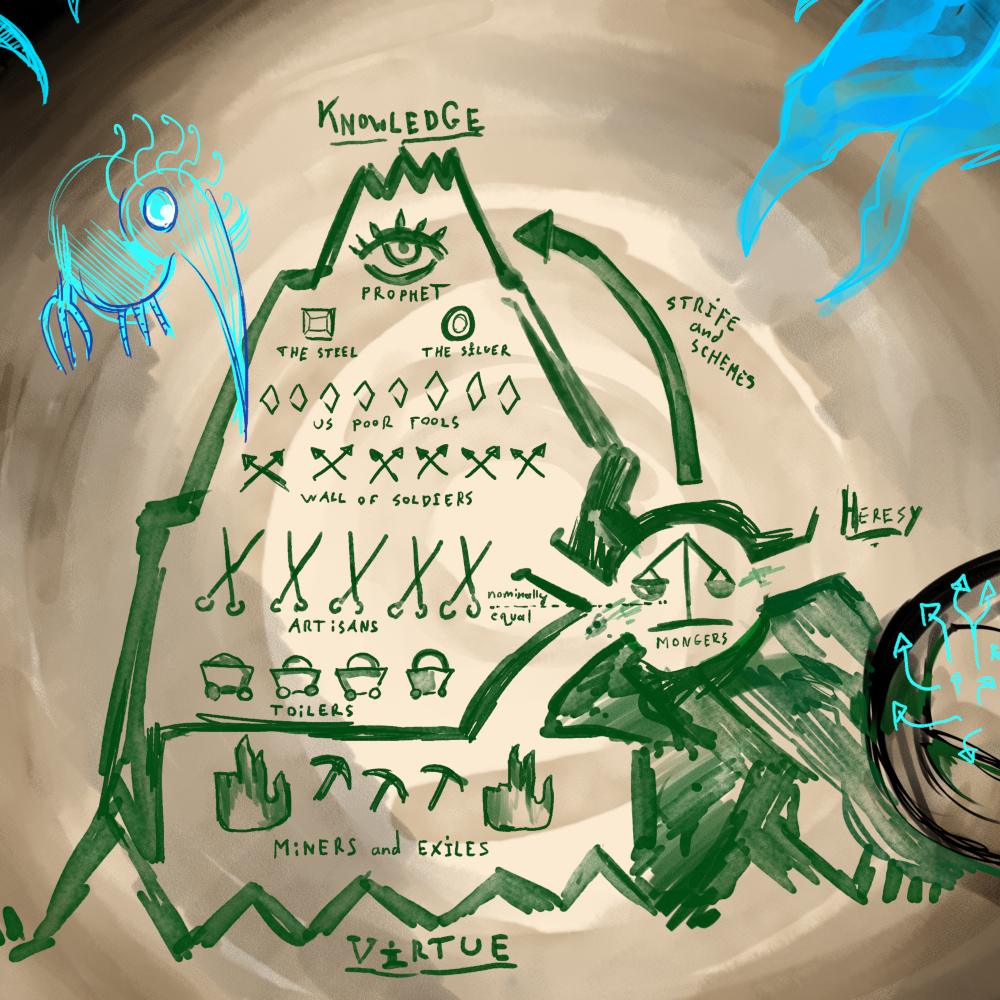Of course, Four and your Martinets already saw Chast doing his mumbo jumbo and offering his terms. We will have to convince them that he and the miners are being used by the Mongers if we don't want to have their rebellion stamped out immedeatedly.