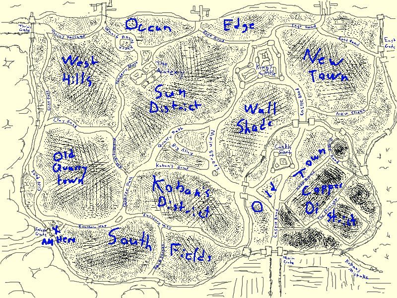 In prosperous times, the West Hills Was probably the most diverse of the districts. Originally, it was filled with poor but earthy folks. The tunnel and cavern dwellers dug into the hill, crowding out the people who could afford to live somewhere more private. With such cheap housing though, brought in the artists and the students of magic. Giving the district a very eccentric flair. The view from the West Hills was not lost on the wealthy, however, and it was a known axiom that if you can't afford a manse in the Sun District then you built a villa on top the West Hills. The whole district was under-going gentrification, and there was a lot of class tension among the folks there. For myself, I was eyeing a loft within the hills to live in once my time at the academy was done. I'm kind of curious if it's still there.