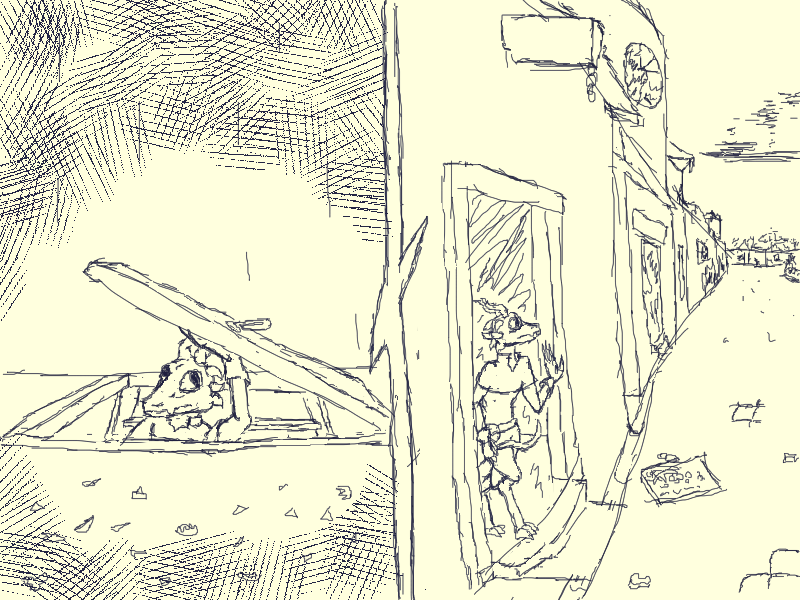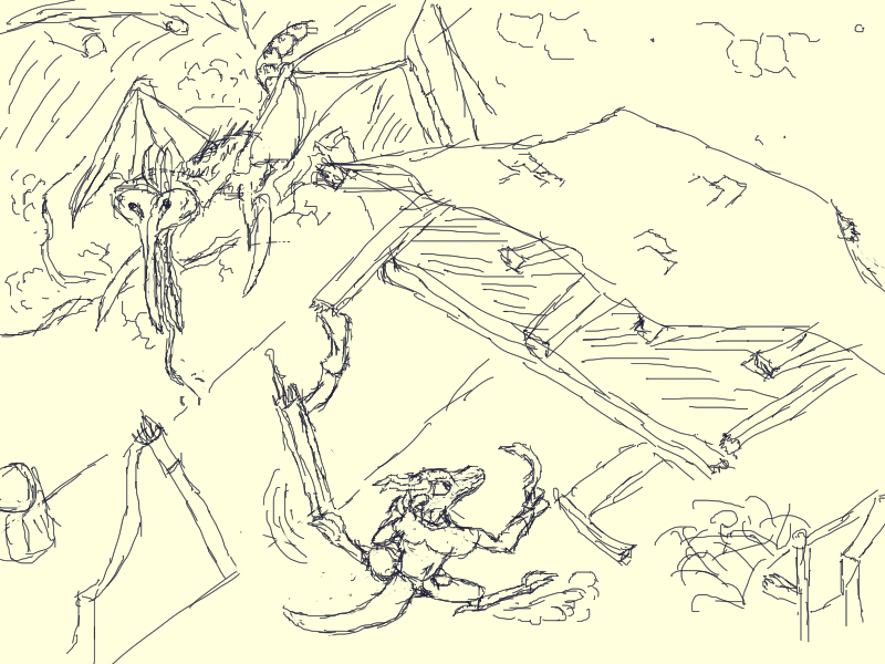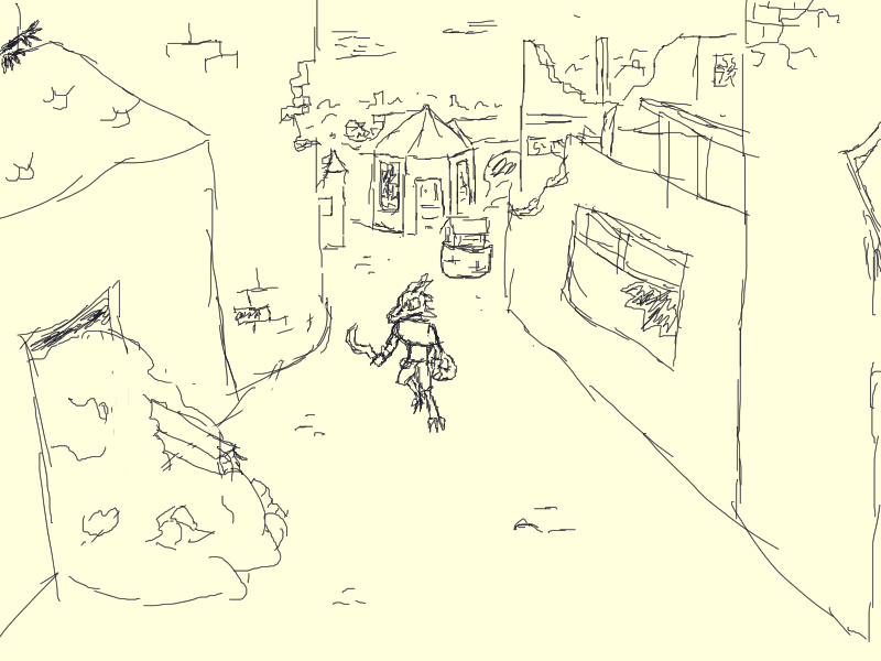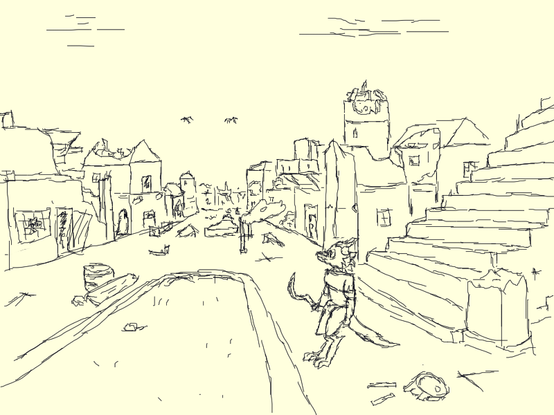 Otherwise, looking down the street eastwards there appears to be little in the way of obstacles. There are more creatures flying in the sky. Presumable they scout these wide roads for prey. They might be able to spot me if I travel parralel to the road amongst the buildings, but it would offer me more protection than the open street.