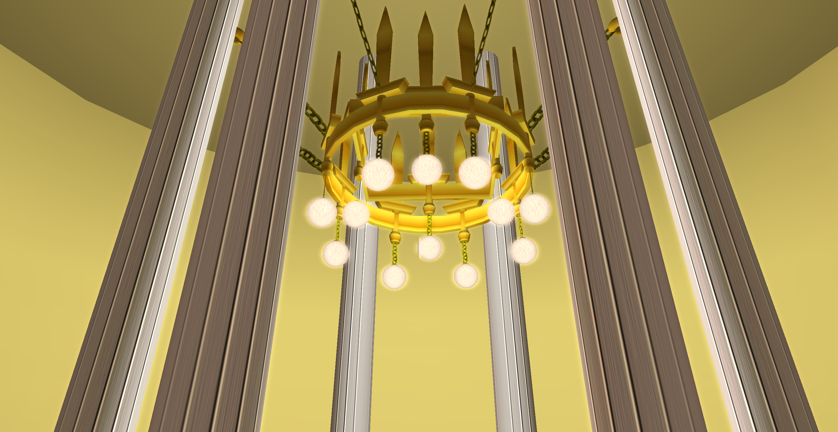 Vaulted ceiling is enameled bright blue, with an enormous sun of crimson, yellow, silver, and gold at the apex. Center of the painted sun is a yard-wide disk of gray glass, which functions identically to the lights elsewhere in the manse. Floor is blue tiles with golden sunbursts, walls are a gilded latticework outlining diamond-shaped segments of veined marble with a gold boss in the middle of each, and a row of the usual vinework along the top.