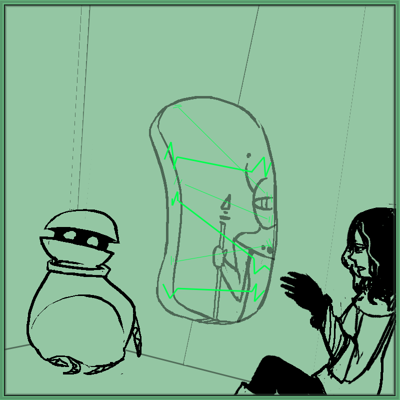 “I apologize for having to utilize this rather primitive method of communicating with a vocalizing species, but my artificial voicebox was stolen from me,” my borrowed throat gargles on. “I attempted to ask for help recovering it, but I’m afraid my efforts to engage in this form of speech were mistaken for acts of violence, and I was imprisoned here.”