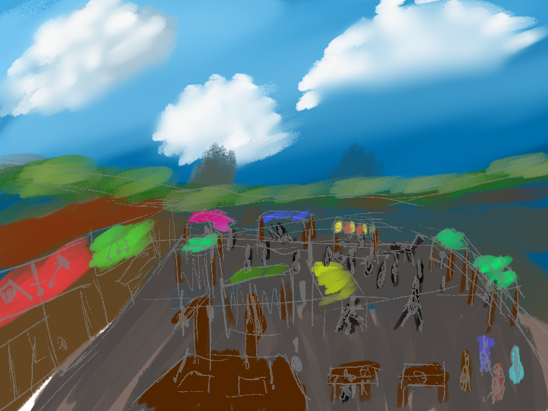 None the less, he explains the hideout is... built up, on top of ruins. The surroundings are an overgrown clearing, with no trail that leads to it, although there is a stream nearby.