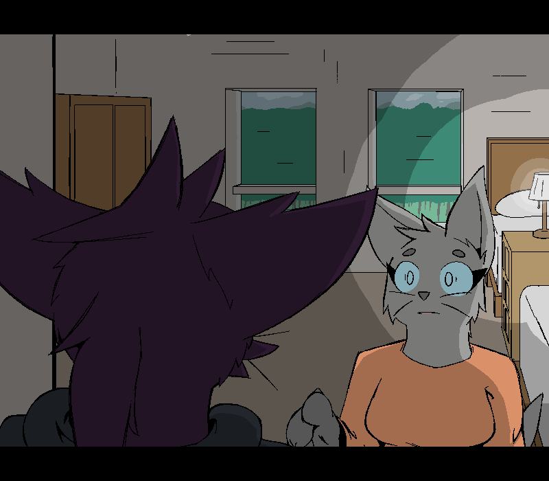 “... Well, here, set that on the bed, to start with.” We walk over to her bed and she sets her suitcase down on it, then we sit on opposite sides. ... The bed audibly creaks under her weight.