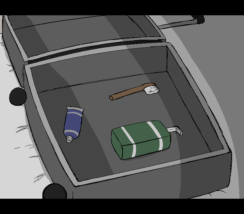Swing and a miss. She looks away from me and the suitcase and at her feet instead. Probably should avoid that subject too for now.