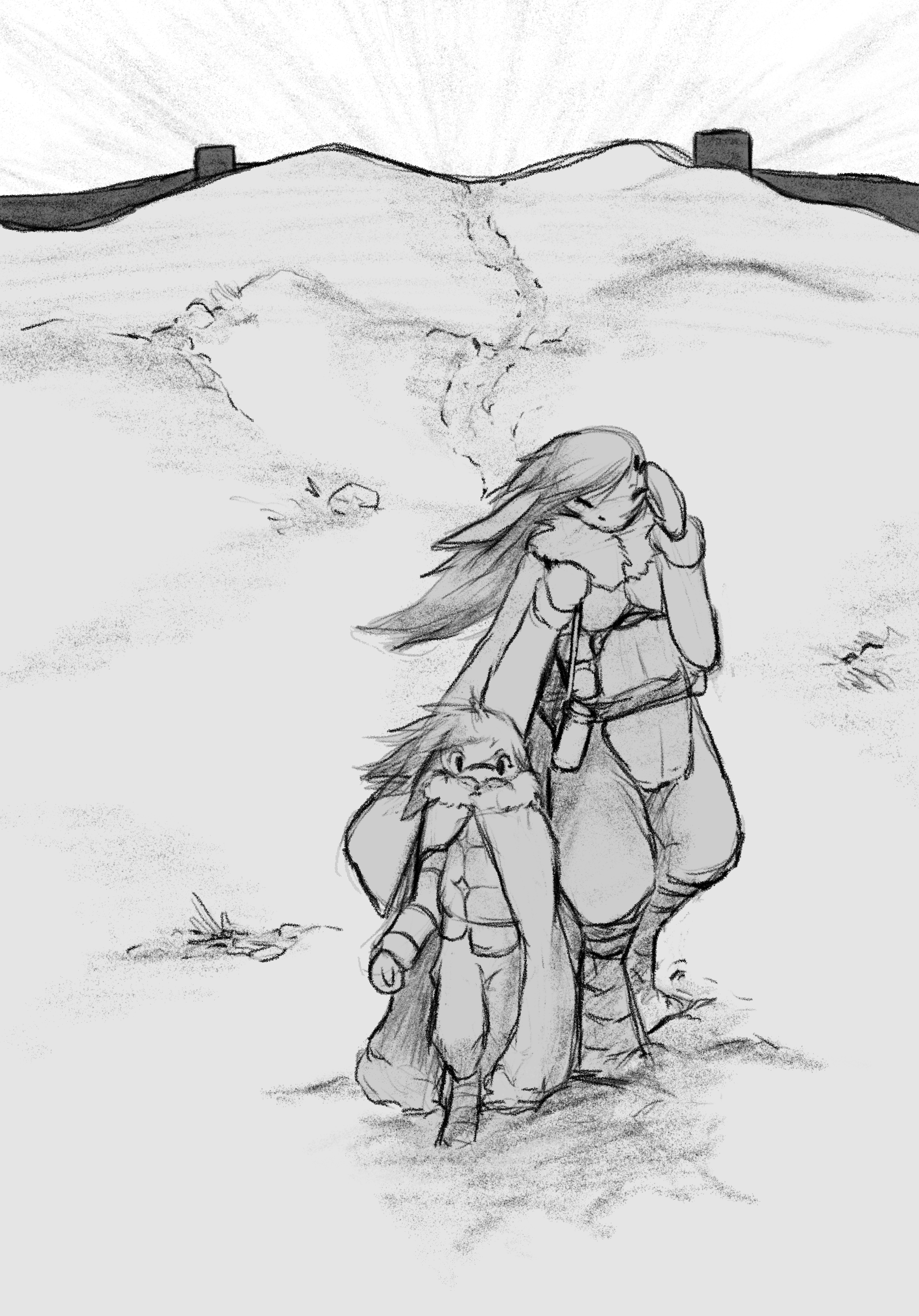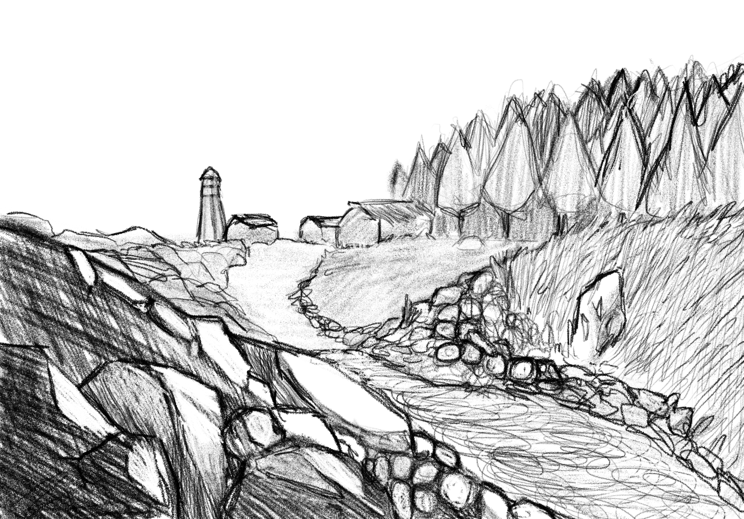 Here, the road splits the ground, separating where the rocks ends and the dirt starts. Already overtaken with long grass, it’s here where the kingdom starts. We could go in, but then news would spread of where we are.