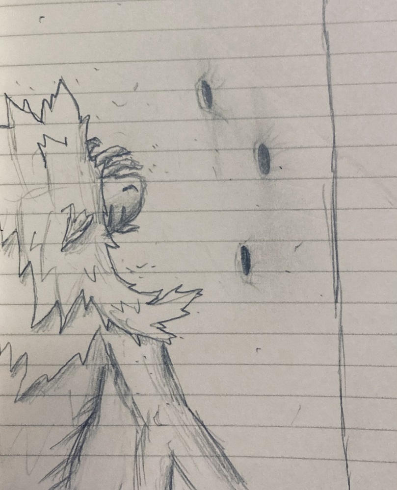 I take it and investigate the hissing in the next room, slowly peaking around the corner. My eyes are drawn to a trio of holes, punched inwards towards the room. On closer inspection, there seems to be no room on the other side of them, or... anything for that matter. Just pure blackness, with air hissing out through the gaps. Tiny metal flakes dance and glitter in the air, also being pulled through into the darkness.