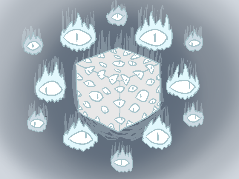 The Landlord is a floating white cube covered in eyes. And, has, uh, more eyes. I don’t know what it actually is or who it is outside of our relationship as tenant to property owner. It started considering me impure or something like that recently and will only talk to Seecha, who is terrified of it.