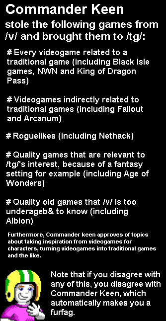 >3. Based on past incidents, there are some specific cases. Minecraft and Dwarf Fortress are generally welcome on /tg/, but don't overdo it. My Little Pony is NOT welcome, even in the guise of a traditional game. Dofus and Wakfu are welcome, if it's a traditional game. Talking about the animation or the MMORPGs will not be tolerated. Touhou has its place in /jp/ and /v/.