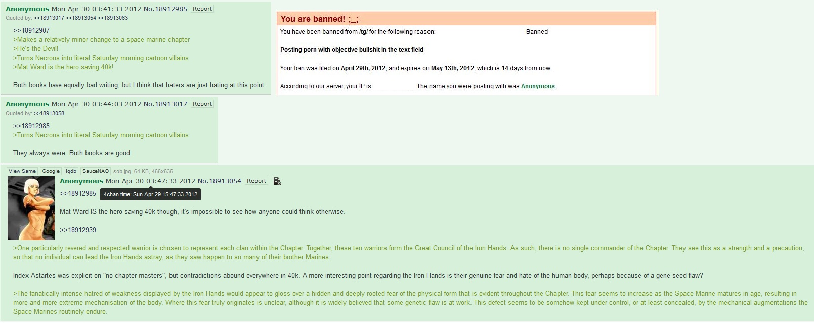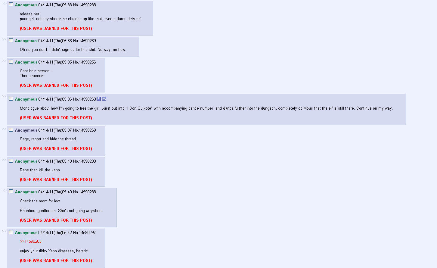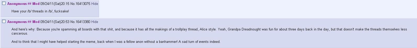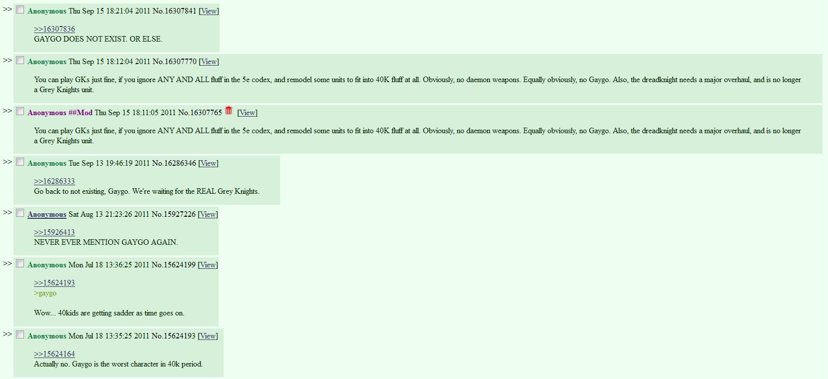 Meta for 4chan /tg/ was moved here because it's now a delete-on-site offense, which makes it awful hard to talk about. Here, there is no such rule.