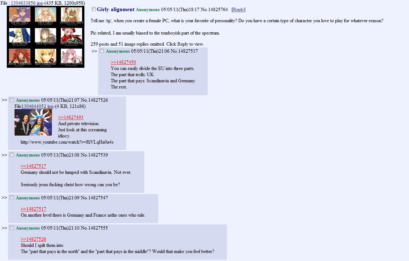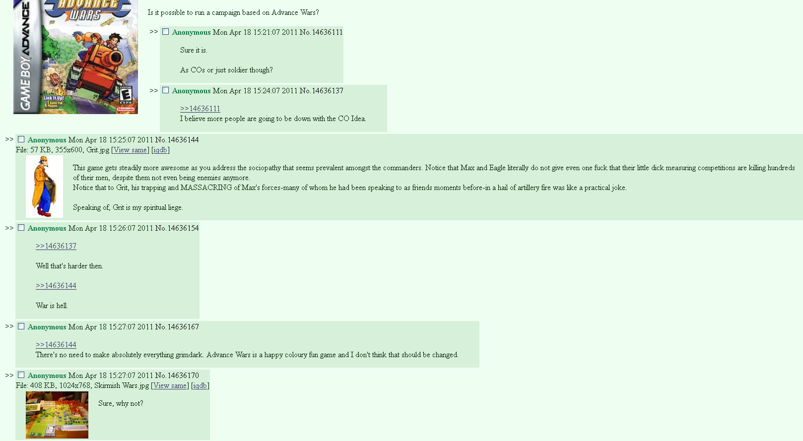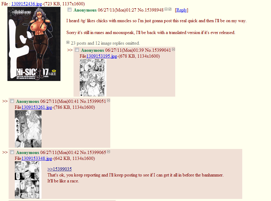 Meta for 4chan /tg/ was moved here because it's now a delete-on-site offense, which makes it awful hard to talk about. Here, there is no such rule.