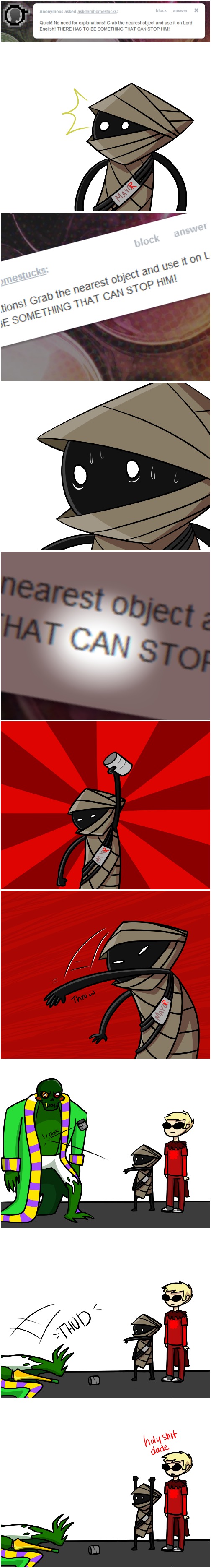 3: Calliope mentioning topspin and thus "english" means nothing, since she didn't connect it with billiards. If anything, it was a red herring. We as yet have no indication at all where the pool theme or the name Lord English came from. It's even possible that Caliborn took that name because of Jake's last name! Time loop. Caliborn abandoning "games with idiots" actually fits with Lord English, since he doesn't even play games. He just up and destroys shit. He delegates the game playing to his servants like Doc Scratch.