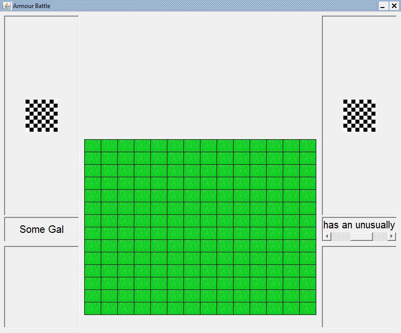 This is currently the maximum size map (14x14) that can be displayed before being too big, unless I add scrolling or some other similar feature, or rearrange the display. No pieces, or tiles other than grass, implemented yet.